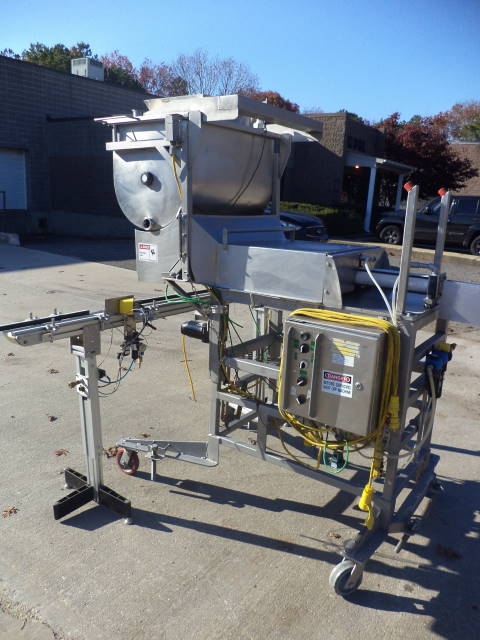 1-Used Simplex Model V-300 Automatic Piston Filling Machine, S/N 5122. Presently equipped with two pistons each measuring approx. 4.5 in. diameter X 13 in. long, filler can accept third piston if added capacity is needed. Equipped with top mounted stainless steel approx. 20 in. X 30 in. X 21 in. agitated hopper driven by wash down electric motor. Filler has stainless steel construction with sani-clamp connections. Equipped with stainless steel control panel. On casters for portability, Filler can be supplied with Conveyor at additional cost. Suitable for viscous applications such as lotions, gels, creams, sauces, etc. (Stock #7936A)