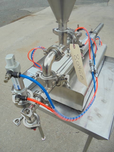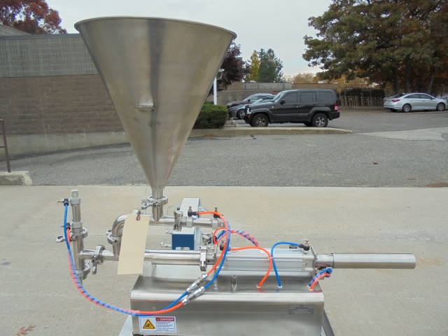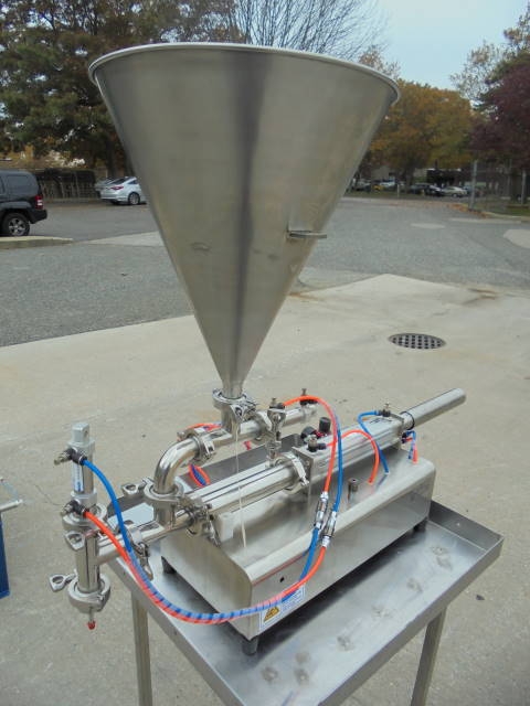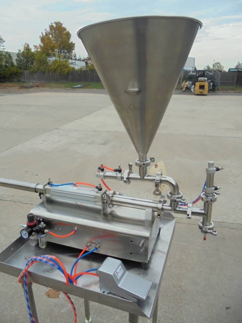 1-Used Tabletop Semi-Automatic Single Piston Filler Model SVF1-240, S/N 20110704. This Air Operated Filler can operate up to 20 containers per minute with approx. 16 in. diameter conical product hopper. Filling piston measures approx. 1-3/4 in. diameter X 7-1/2 in. long. Stainless Steel Table shown in photographs available at additional cost. (Stock #8046B)