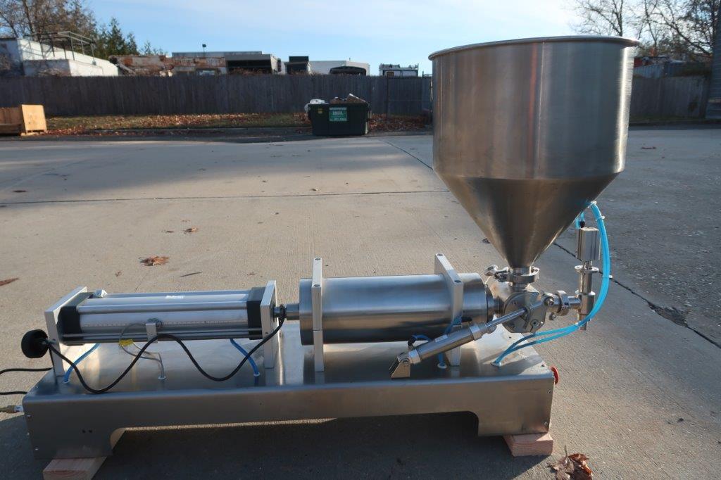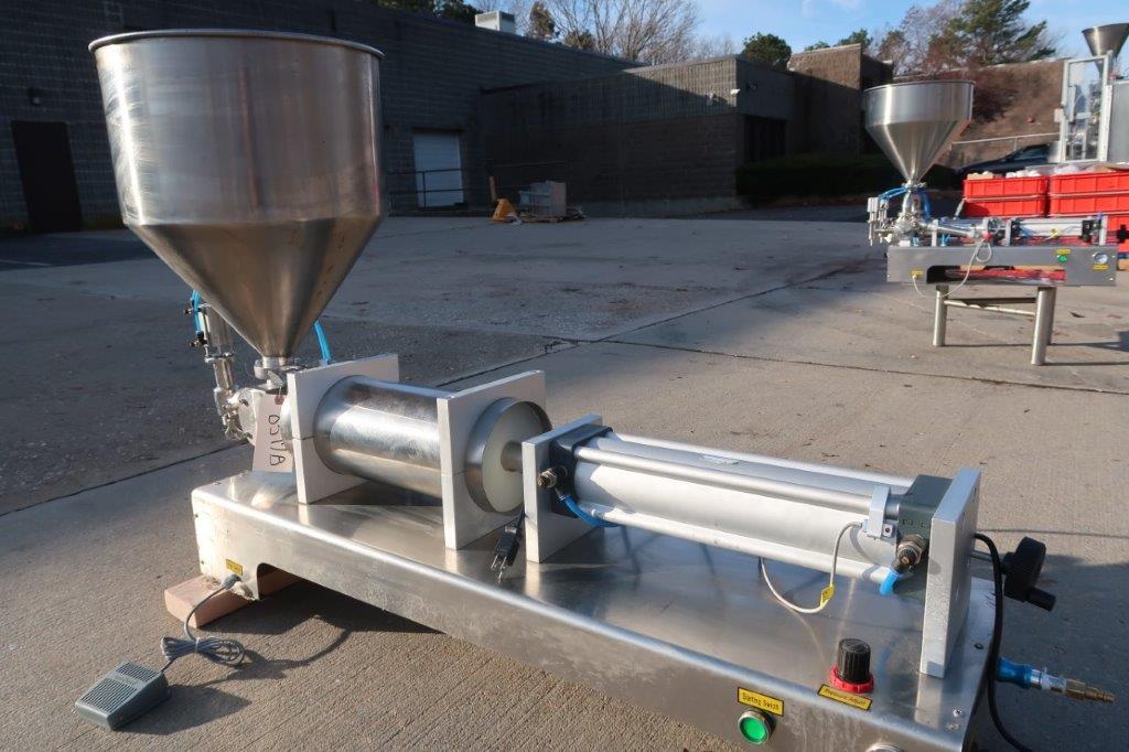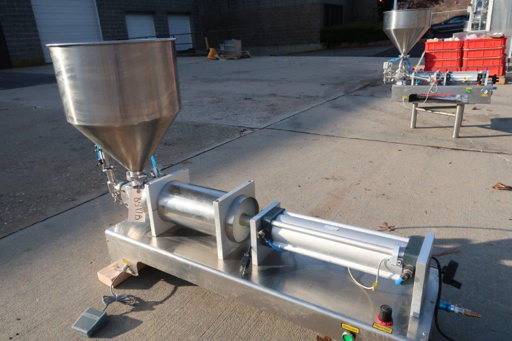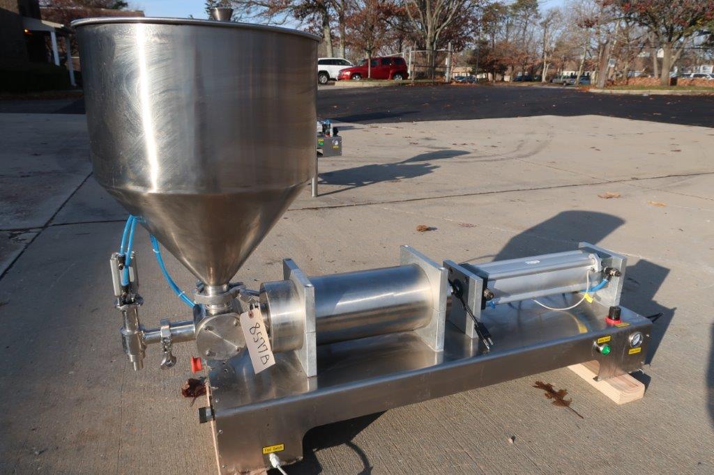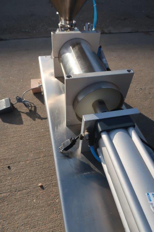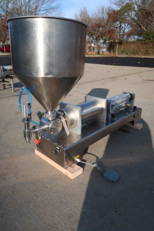 1-Used Tabletop Stainless Steel Air Operated Single Piston Filling Machine.  Designed for filling large containers,  product piston measures approximately 6 In. diameter X 16 In. Long.  With stainless steel base, filler has 16 In. diameter top product hopper and foot switch for activating filling cycle (Stock #8577B)