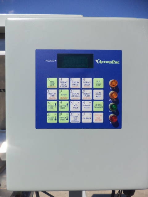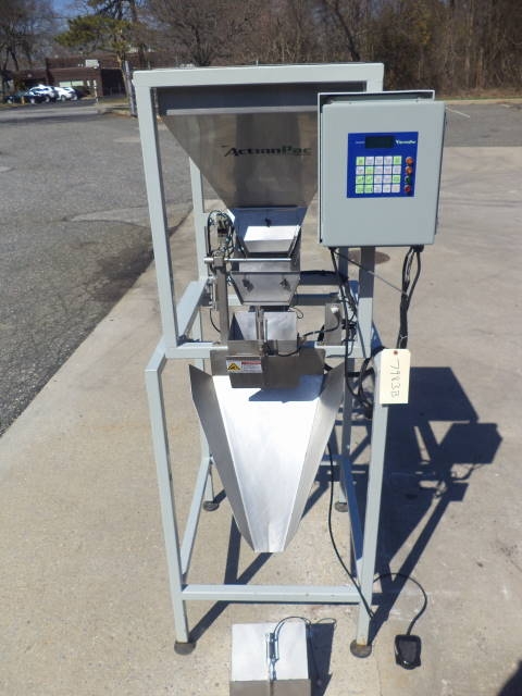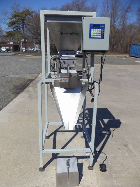 1-Used ActionPac Model ME-1095 Weigh style Filler/Packager, S/N 3908. With stainless steel contact parts, this foot switch actuated Filler/Packager has single phase, 60 cycle, 110 volt electrics. Equipped with spare oversized weigh bucket, machine can be used for a number of applications including filling of solid products like nuts, candies, etc. and granular and powdered products. (Stock #7983B)