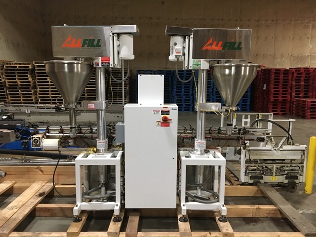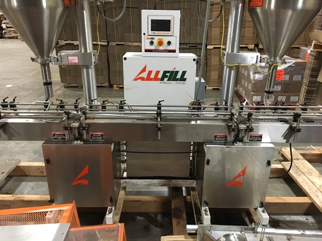 1-Used All Fill Model DHA-600 Dual Head Automatic Powder Filling Machine. Last used in a food application, this conveyorized filler has 3/60/230 Volt electrics. Controls are single phase, 110 Volt. With stainless steel agitated feed hoppers. (Stock #L1281)