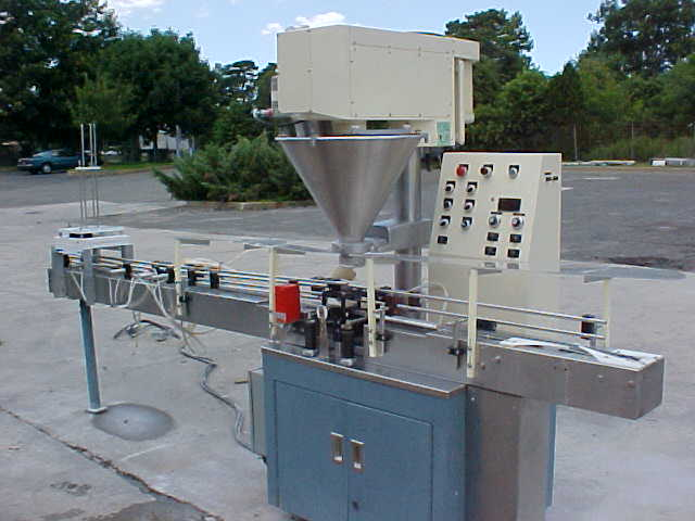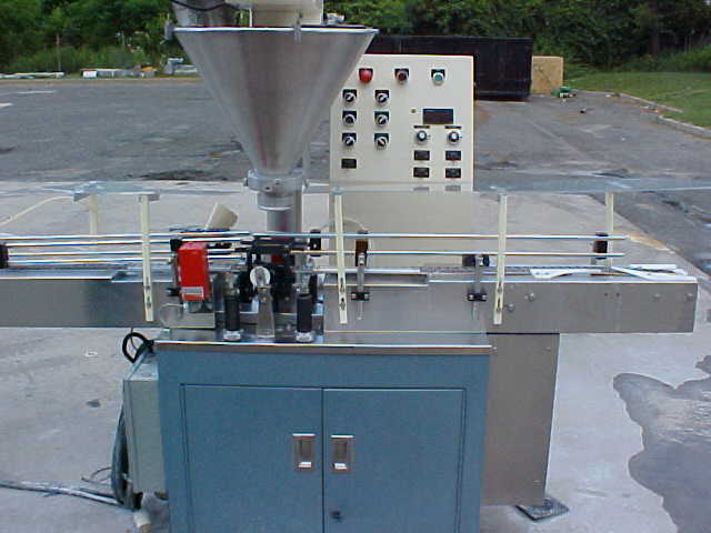 1-USED ALL-FILL SINGLE HEAD AUTOMATIC POWDER FILLING MACHINE,MODEL SHA-200, SERIAL #6811761. WITH APPROX. 12′ LONG STAINLESS STEEL INDEXING CONVEYOR, FILLER HAS WEIGH CELL, SIDE MOUNTED CONTROL PANEL AND CUP DROPPER/DISPENSER. WITH SS CONICAL HOPPER.