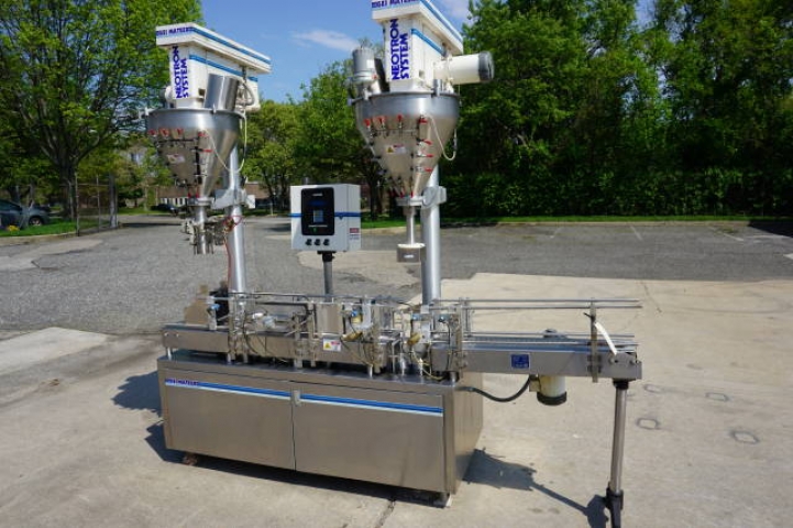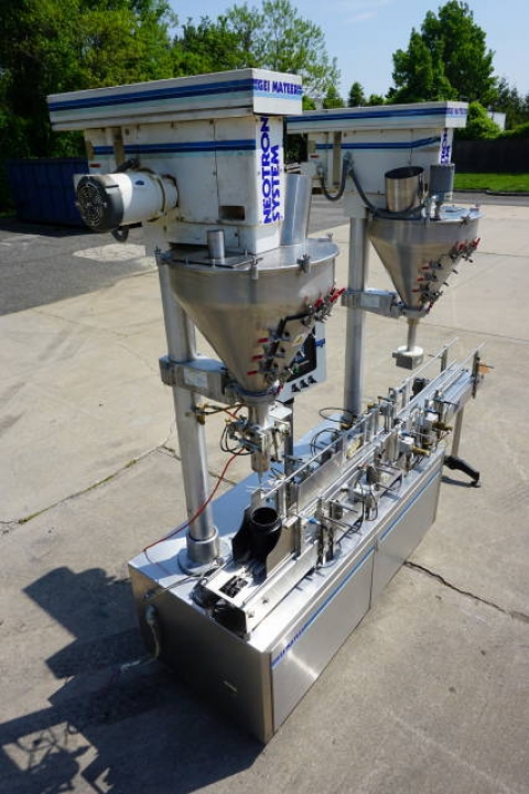 1-Pre-Owned GEI/Mateer Neotron High Speed Dual Station Auger Filling Machine Model 4230, S/N 808830.  Equipped with two (2) 20 In. diameter Stainless Steel Agitated Product Feed Hoppers with lids and front clean-out doors.  Each Hopper has two (2) motors,  one (1) for the fill auger and one (1) for the agitator in the Hopper.  With stainless steel cabinetry, machine has Mateer Microset Control Panel for controlling the fill volume.  With Syntron Vibrating feature for settling of product in container, Filler was last used in food processing operation.  (Stock # 8268Q)
