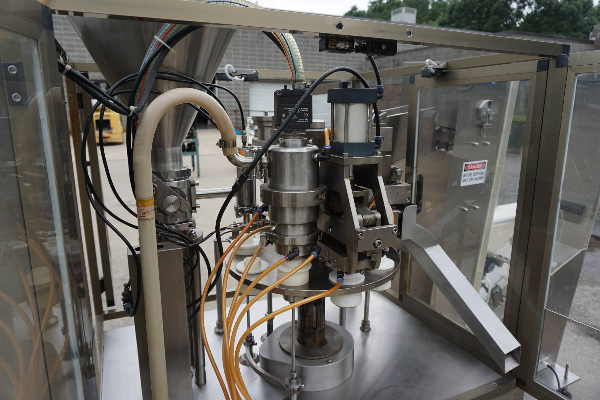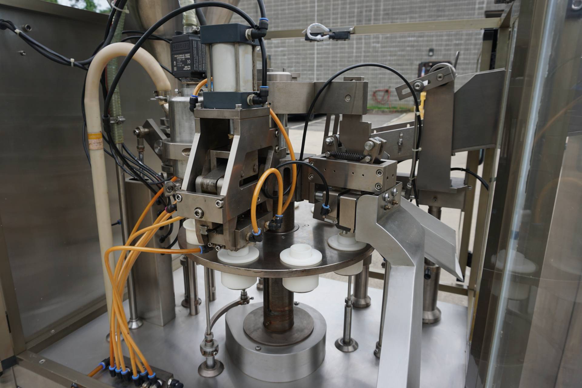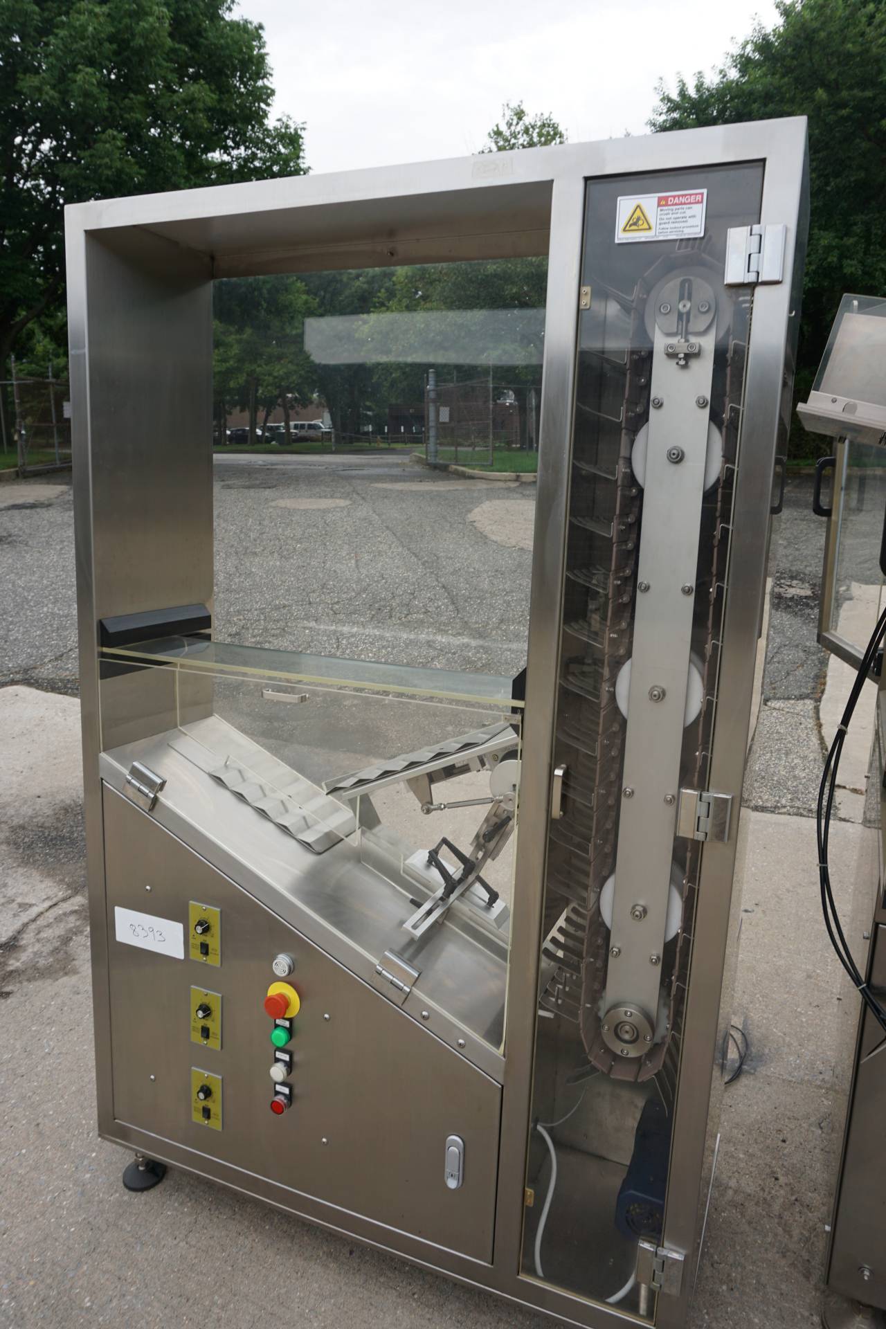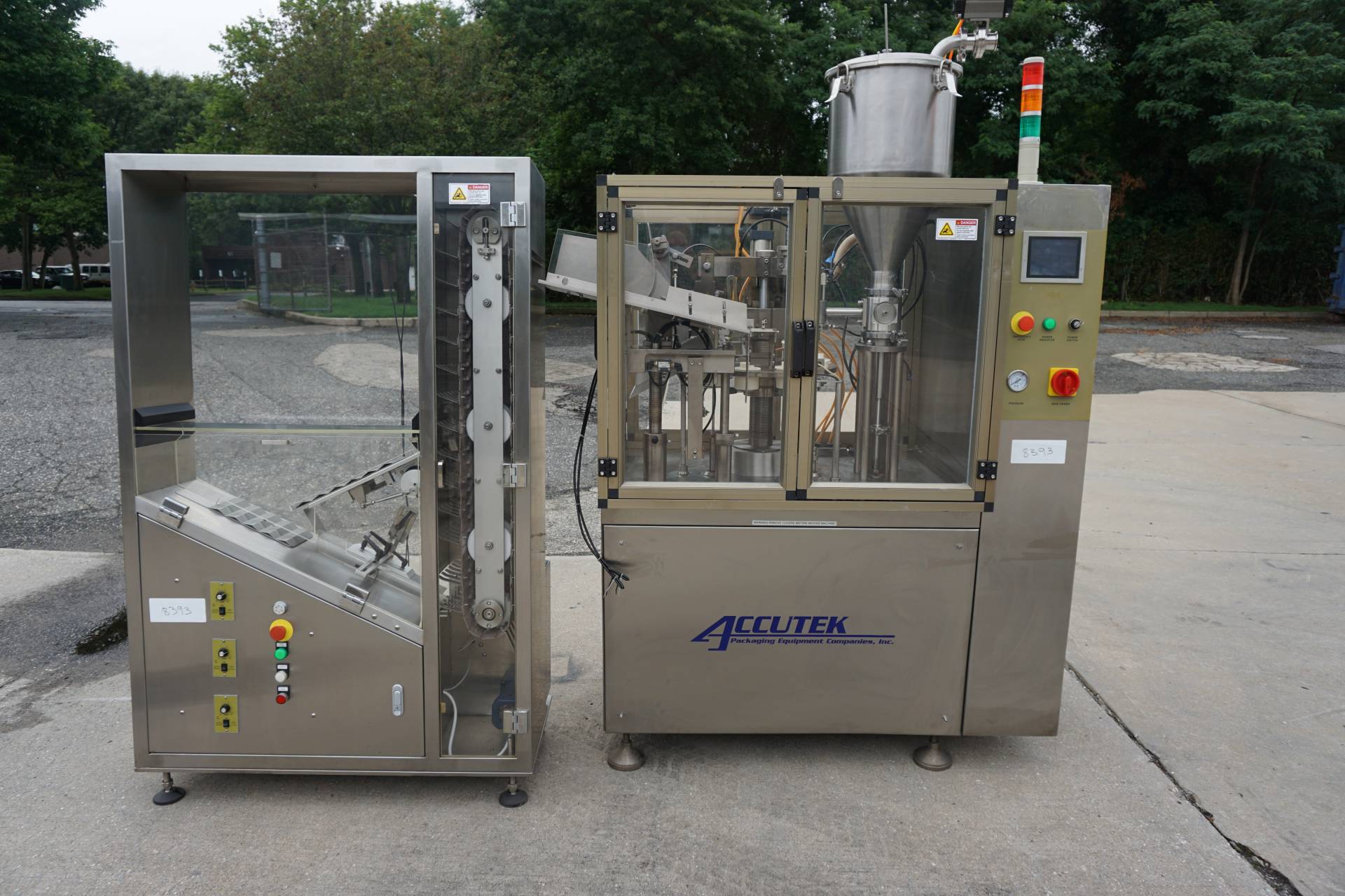 1-Used Accutek Model 50-TFS-1PT Hot Air Automatic Tube Filling and Sealing Machine, Serial Number A-17204388. Rated up to approximately 40 tubes per minute, this plastic tube filler and sealer has stainless steel cabinetry and is equipped with tube orientation and approximately 1-1/4 In. diameter tube holders. With side mounted control panel, machine has electrical specifications 3/60/220 Volt. Filler is supplied with Accutek Model 50-TFS1 stainless steel automatic tube loader, Serial Number A-17204386. (Stock# 8393)