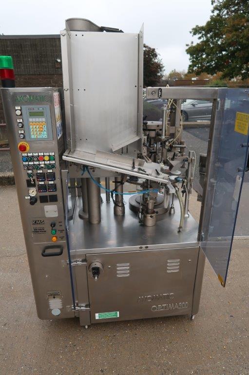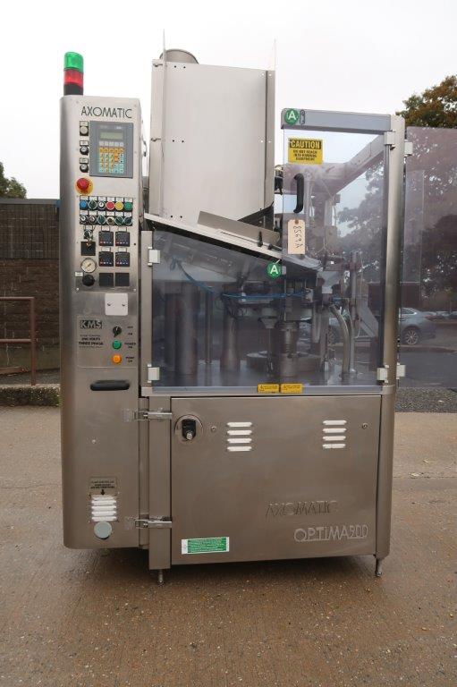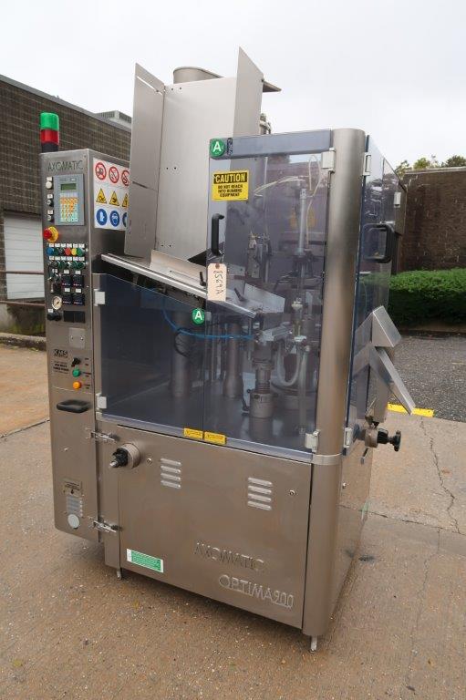 1-Used Axomatic Optima 900 Matic Tube Filling and Sealing machine, Serial number 070298A900-AXO. Rated up to 4,500 Tubes per hour, Machine has Automatic Tube Loading & Positioning System and Auto Fill Station with capacities for 3ml to 250ml. With top mounted Stainless Steel hopper with drive for agitation, filler has Hot Jaw Sealing System, Machine included change parts and spare parts. (Stock #8569A)