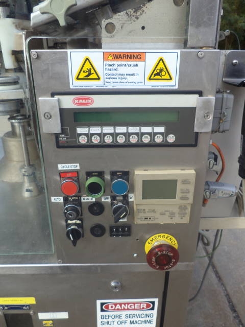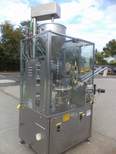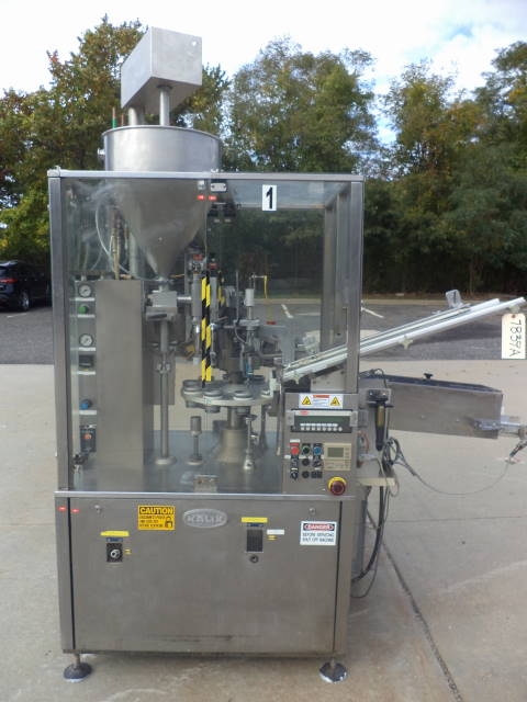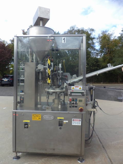 1-Used Kalix KX-70 fully Automatic Hot Air Plastic Tube Filling/Sealing Machine, S/N 8251. With stainless steel cabinetry, machine has stainless steel agitated hopper, tube registration, trimming device and miscellaneous spare parts. Rated up to 70 tubes per minute, tube size up to 200mm diameter. Equipped with approx. 6 in. wide take away conveyor for filled tubes, machine has inclined tube feeder and front mounted control panel. Supplied with Manuals, schematics, etc. (Stock #7839AA)