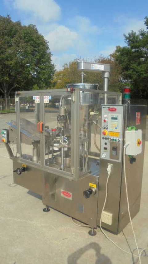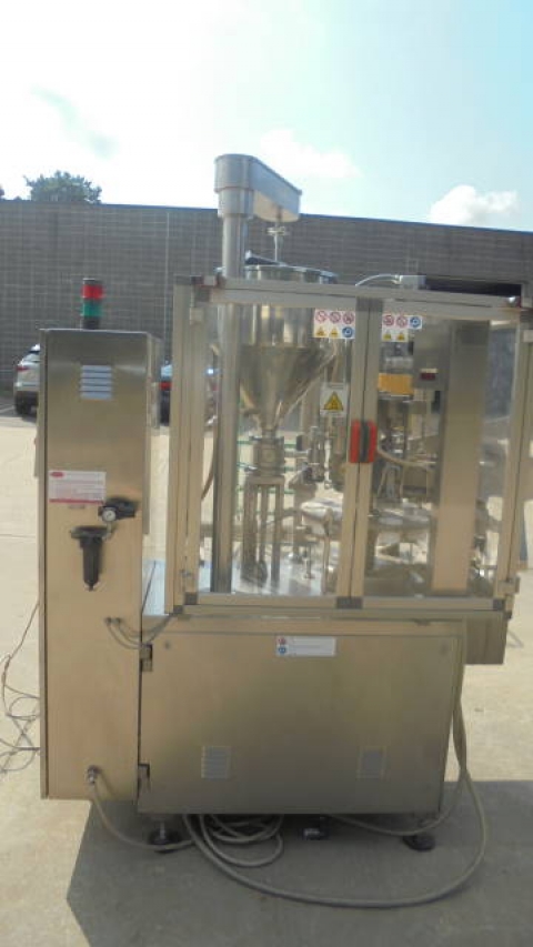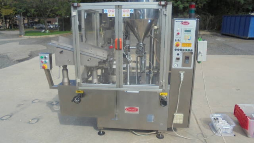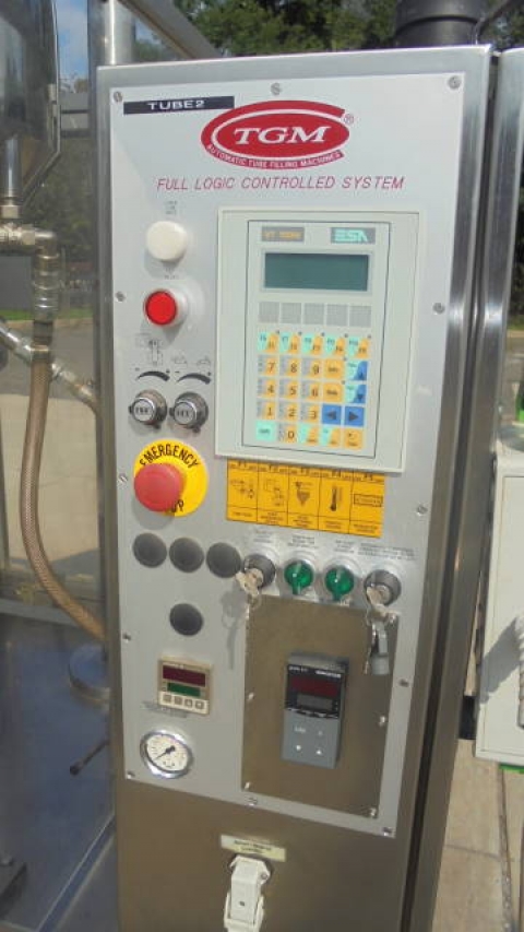 1-Used TGM Model E-25O MATIC Hot Air Automatic Plastic Tube Filling & Sealing Machine, S/N 15E250285/00. Last used on personal care products, machine rated up to approx. 60 tubes per minute. Machine has numerous features including stainless steel jacketed and agitated hopper, self-contained control panel, tube registration and miscellaneous change parts for different size tubes. Electrical specifications: 3/60/220 volt. (Stock #L1298)
