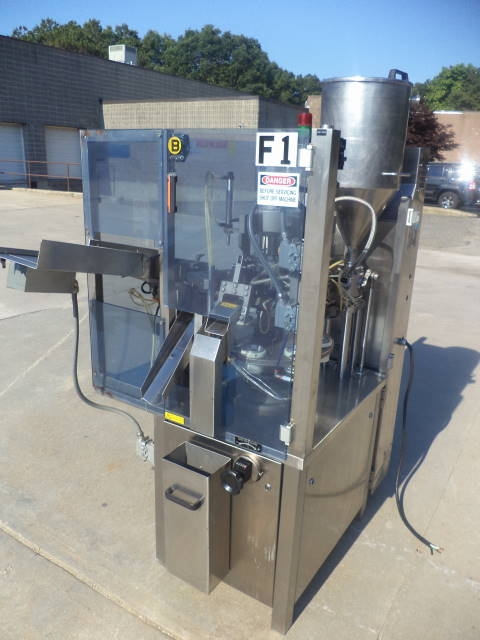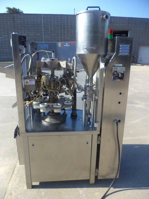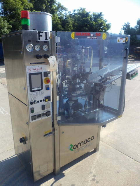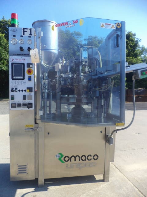 1-Used Unipac “Jolly 50” Automatic Plastic Tube Filling and Sealing Machine, S/N 03033095-8J. Last used on laminate tubes, machine is rated up to 3,000 tubes per hour. With stainless steel cabinetry, filler has tube orientation as well as 13 In. diameter stainless conical product hopper with lid. Presently equipped with tube inserts for approximately 1-3/4 In. diameter tube, filler last used in the personal care products industry. Electrical specifications 3 phase, 220 Volt. (Stock# 7906)