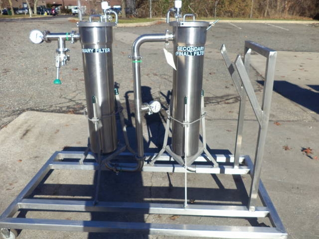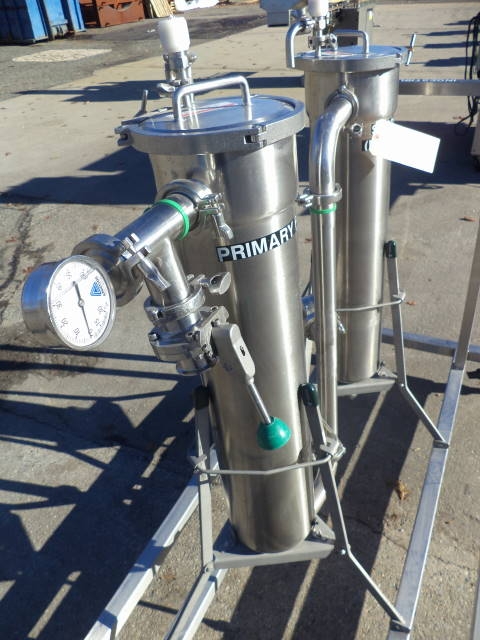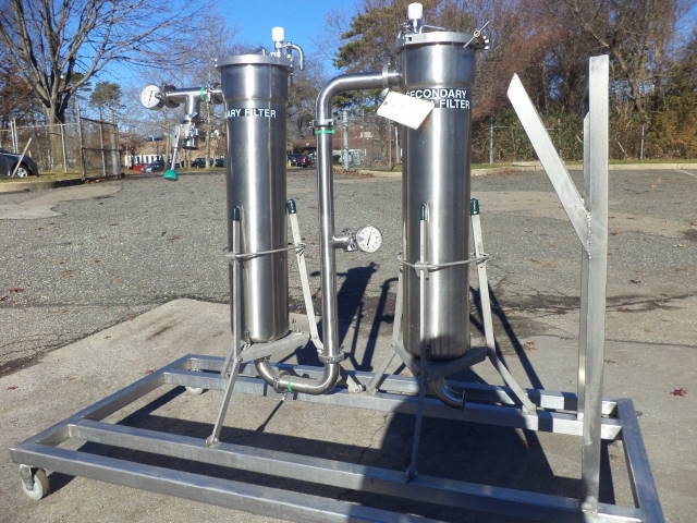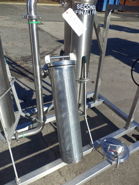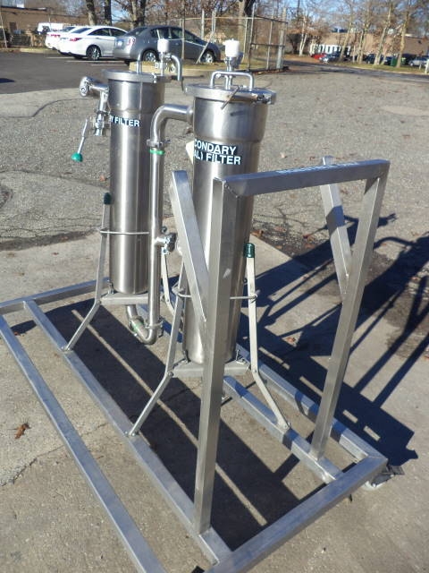 1-Used Alfa Laval Tandam of two (2) 9 in. diameter X 36 in. high Basket Filters. Constructed of Type 316 stainless steel both basket filters are mounted on common stainless steel portable stand. (Stock #7953JJ)
