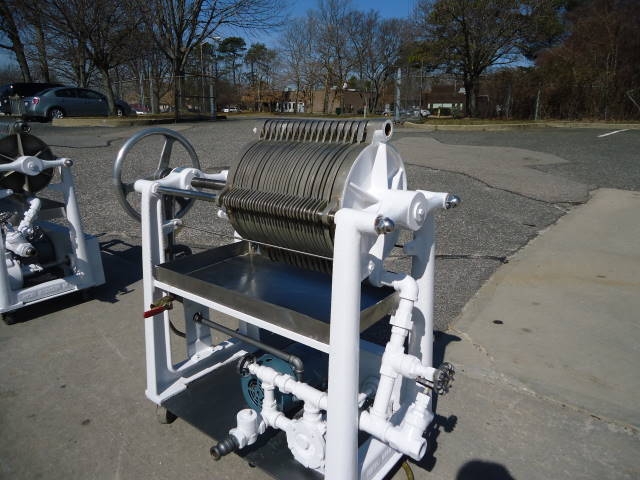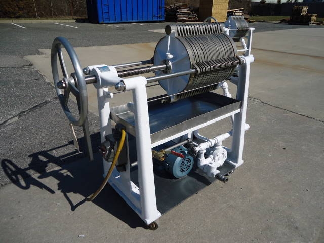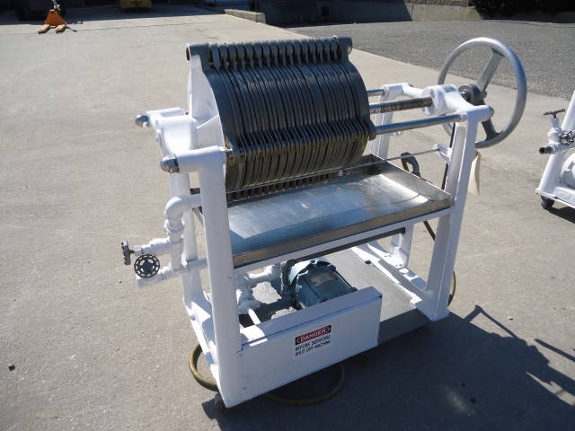 1-USED ERTEL APPROX. 12 IN. DIAMETER FILTER PRESS MODEL EW-30, S/N 1255-BH. THIS 32 DISC FILTER PRESS HAS STAINLESS STEEL DRIP TRAY AND IS MOUNTED ON PORTABLE BASE WITH CASTERS. EQUIPPED WITH VIKING PUMP DRIVEN BY 1/2 HP SINGLE PHASE, 60 CYCLE, 115-230 VOLT EXPLOSION PROOF MOTOR. (STOCK #7562F)