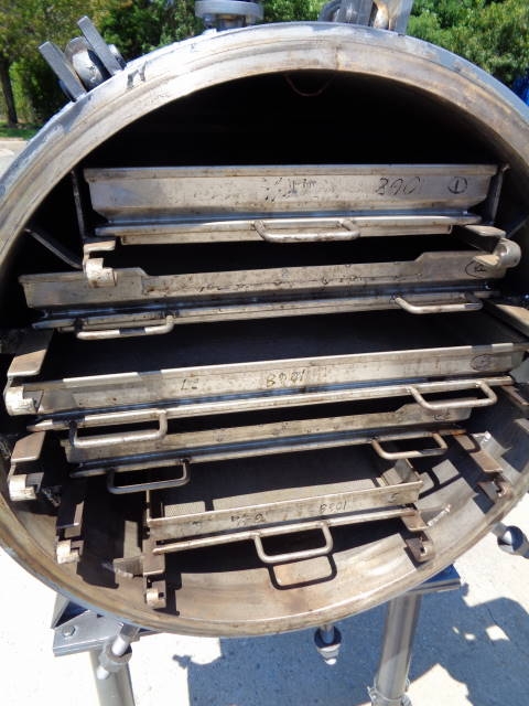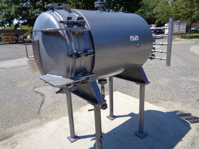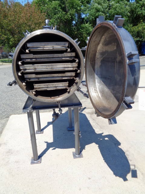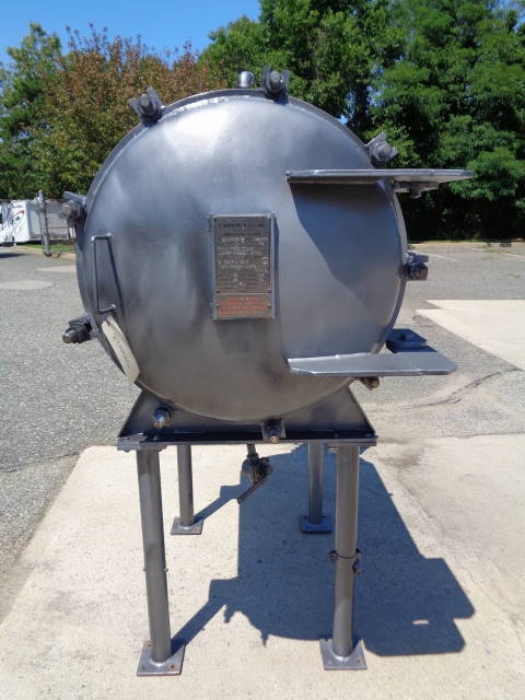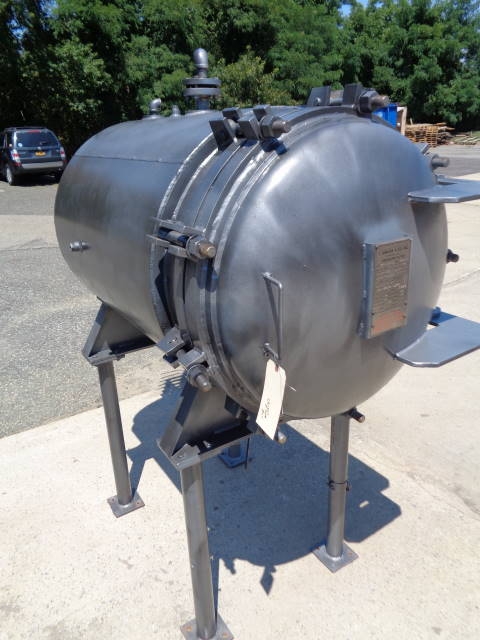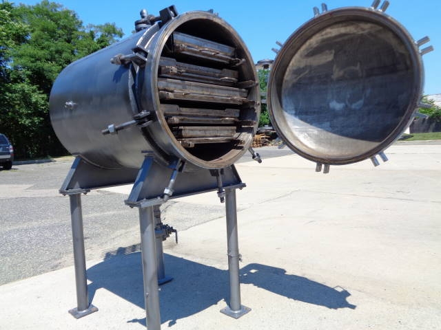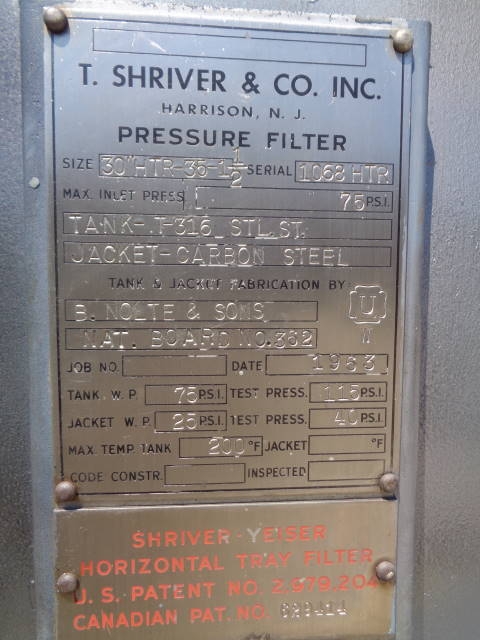 1-Used Shriver Size 30 In. HTR-35-1.5 Horizontal Tray Filter, S/N 1068-HTR. This Pressure Filter is constructed of 316 stainless steel internally and jacketed for 25 PSI @ 200 degrees F. Internal pressure 75 PSI. National Board # 362, Code Stamped. Equipped with five (5) horizontal trays with mesh lining, Filter has quick opening front door assembly and approx. 1-1/2 in. diameter center bottom liquid discharge. Mounted on approx. 34 in. high legs. There are assorted top openings. (Stock #8022G)