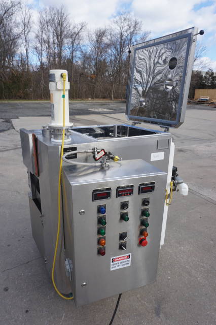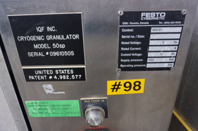 1-Used IQF INC. 50SP Stainless Steel Granulator/Pelletizer, S/N 0961050S. Instantly freezes any liquid or semi-liquid substance into free-flowing pellets of consistent size and shape. Utilizing a liquid nitrogen immersion process, machine can operate in continuous or batch mode. Last used in the nutritional/supplement industry, this GMP machine has self-contained control panel and stainless steel sanitary connections. (Stock #8346)