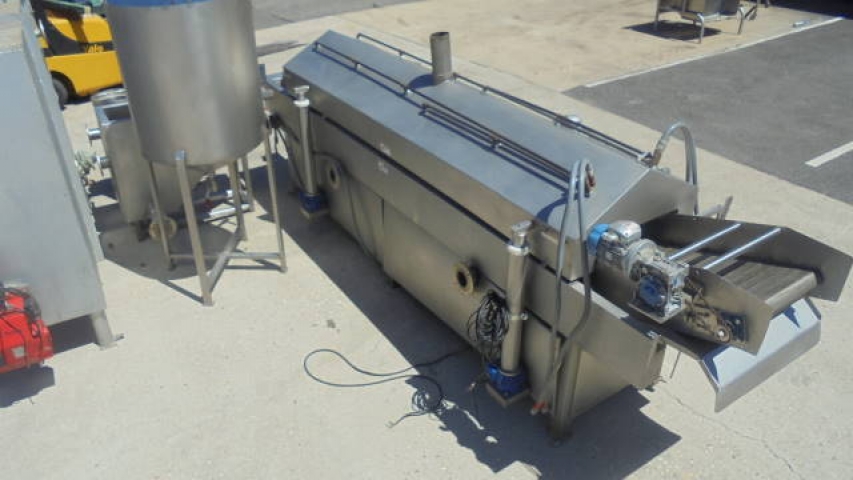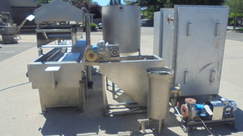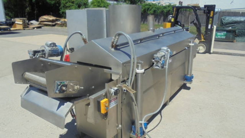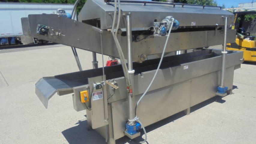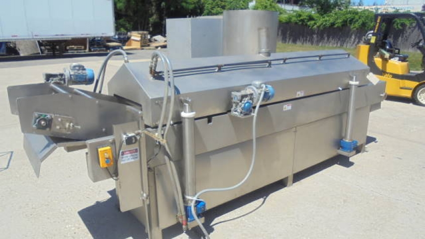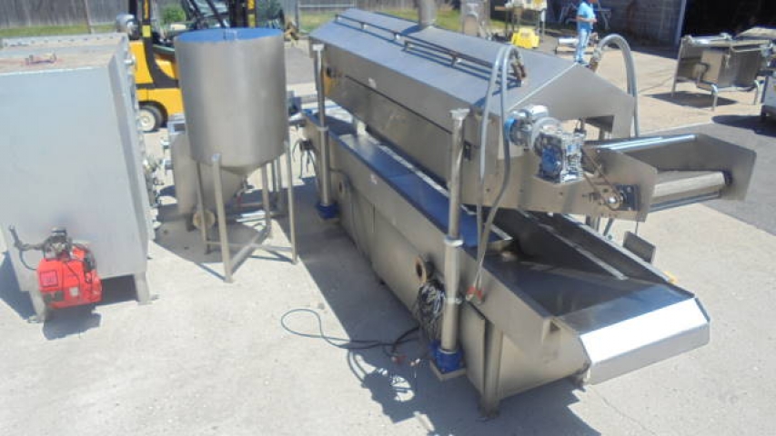 1-Used Stainless Steel Continuous Gas Fired Frying System. Equipped with 20 In. Wide belt, fryer was last used on snack foods and measures approximately 15 Ft. overall length. With “hold-down” belt, fryer system includes stainless steel 31 inch diameter by 35 inch high oil tank on legs, centrifugal pump for oil, belt infeed and filter system, fryer has fire suppression system and motorized lift. (Stock #8201A)