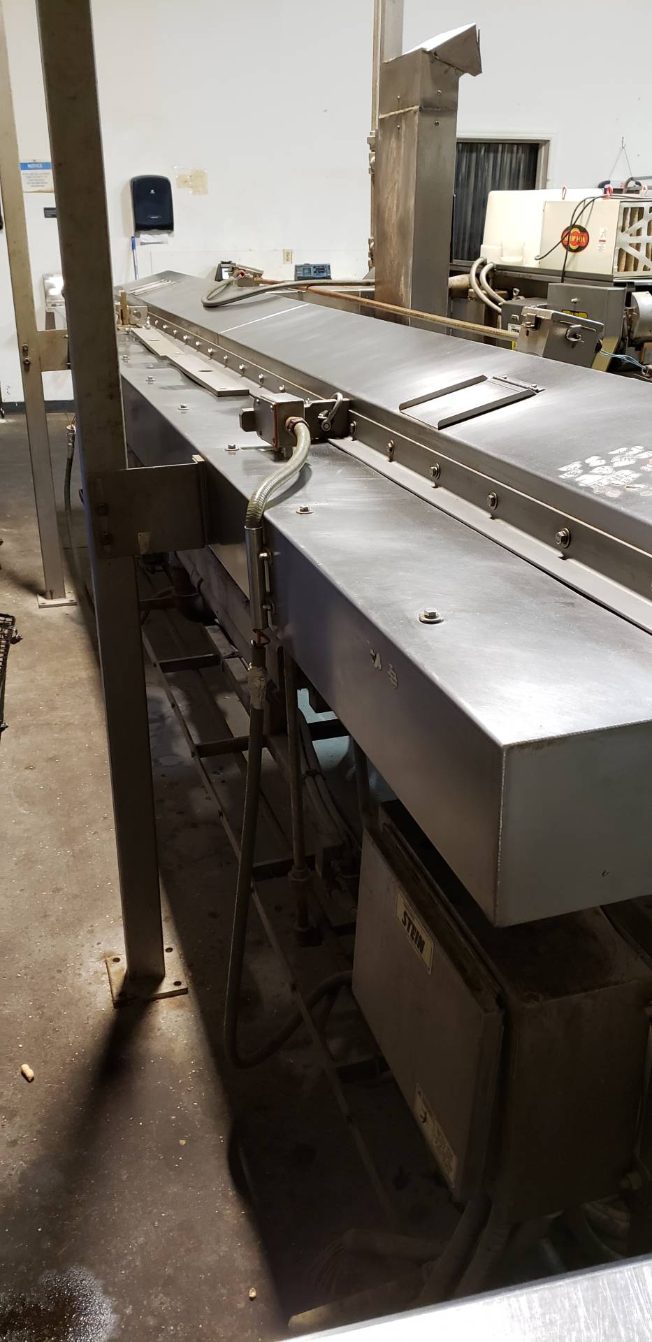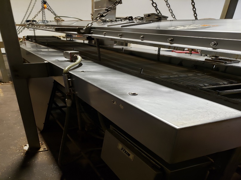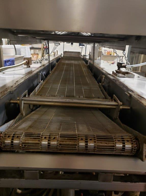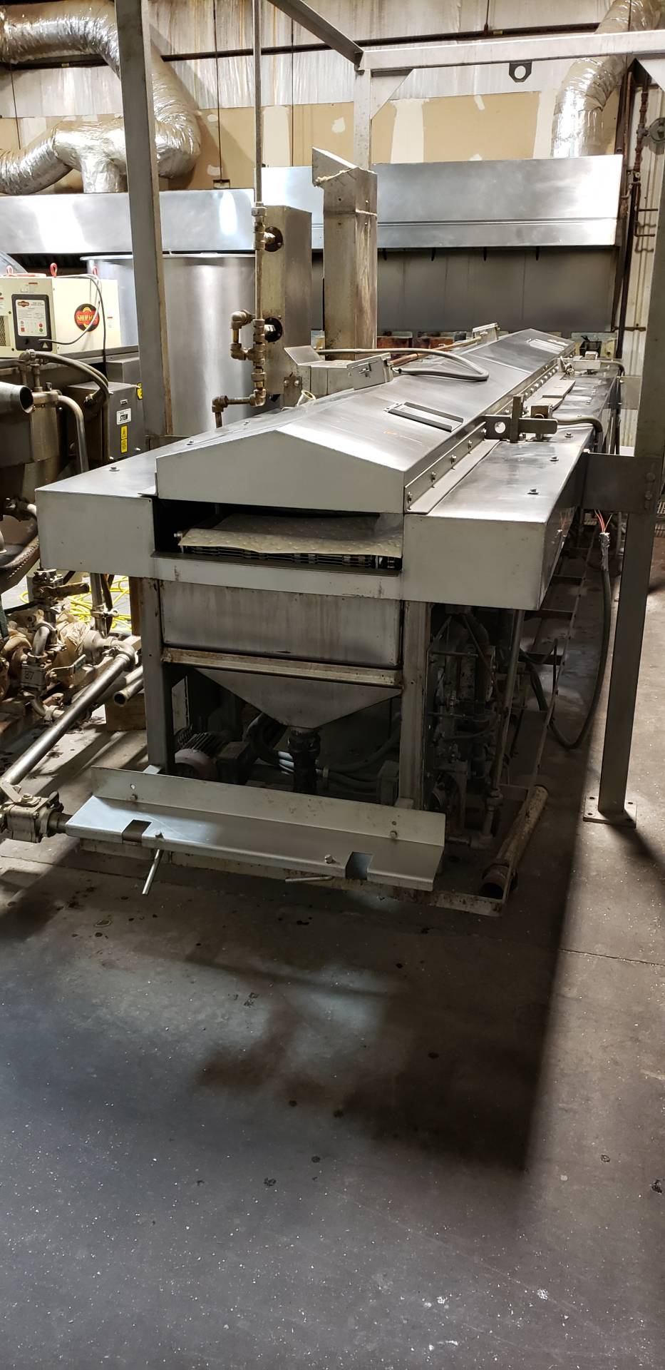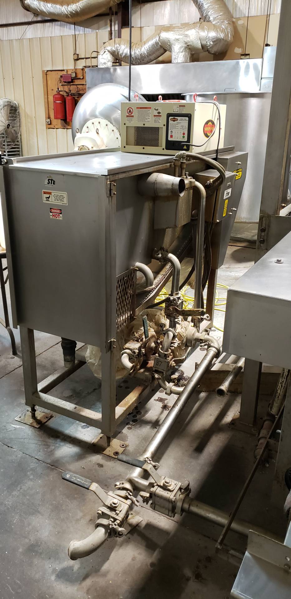 1-Used Stein Gas Fired Continuous Fryer. Equipped with approx. 16″ Wide stainless steel belt, Fryer measures approx. 13 Ft. Long. Fryer is equipped with hold down belt, control panel, Chem Tek 309 Gallon Stainless Steel oil supply tank, a Stein SF-3 filter system, and a Kidde fire suppression system. The fire suppression system includes a control panel in the main control panel, detectors, and CO2 nozzles. (Stock #L1419)