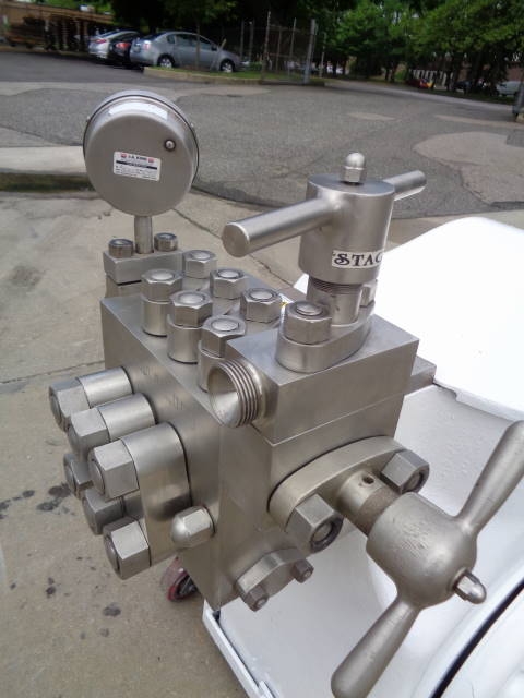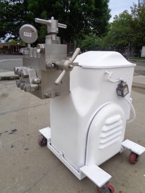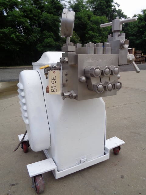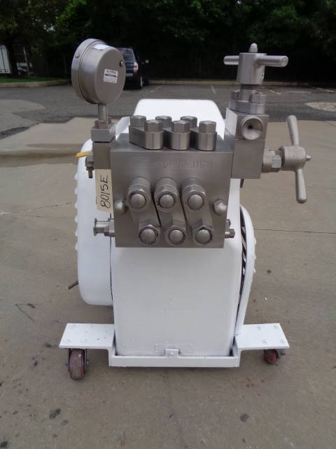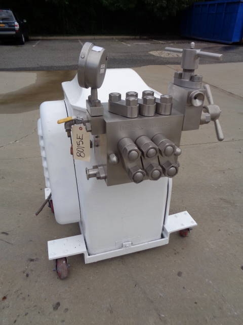 1-Used APV/GAULIN MODEL MP3-3 TP8X-240 Two Stage Homogenizer, S/N 129011591. Mounted on portable base with casters, Homogenizer capable of up to 240 gallons per hour @ 8,000 PSI maximum operating pressure. With stainless steel contact parts. (Stock #8015E)