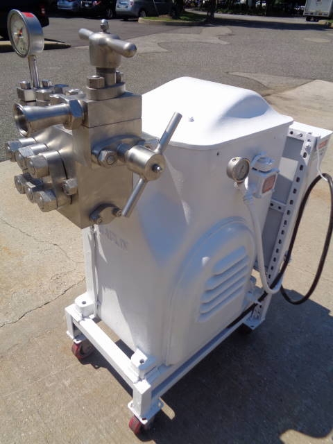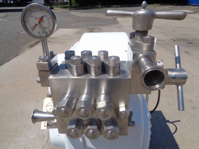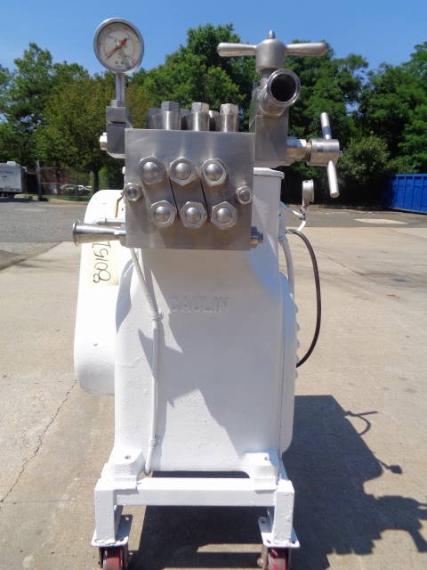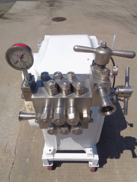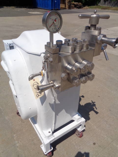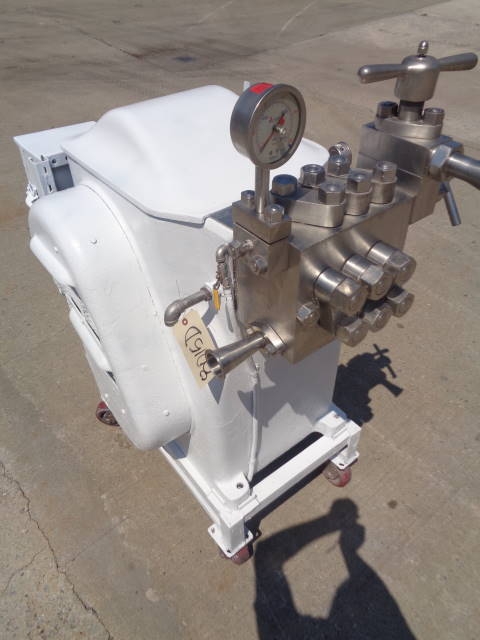 1-Used Gaulin Model 100-ME-8TBS Two Stage Homogenizer, S/N 3704711. Mounted on portable base with casters, Homogenizer has stainless steel contact parts and is rated up to 8,000 PSI operating pressure. Equipped with pressure gauge. (Stock #8015D)