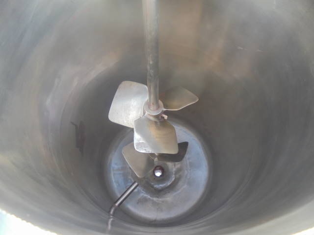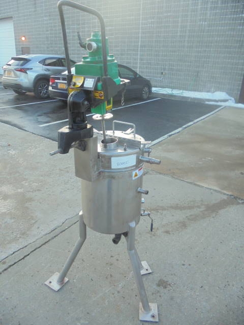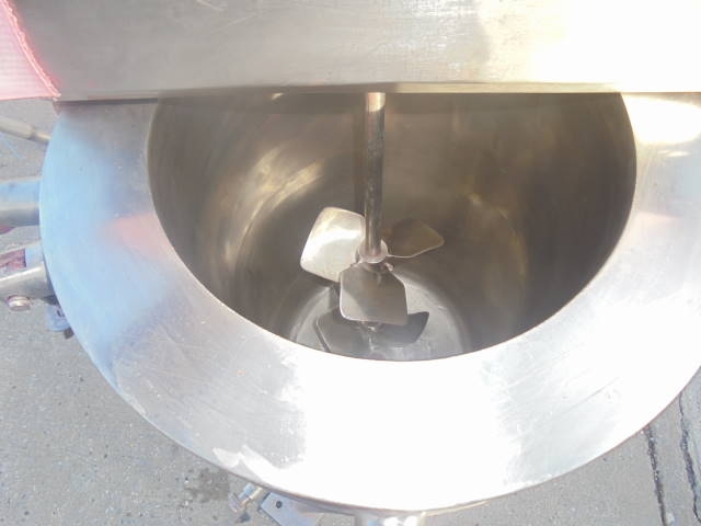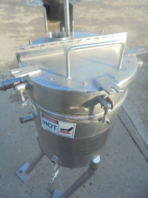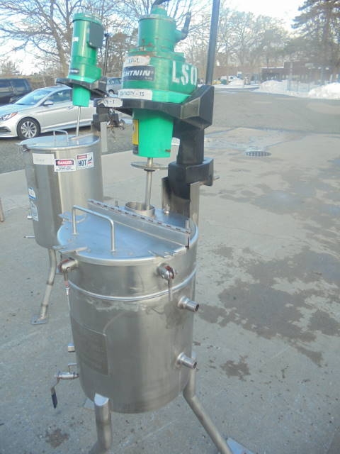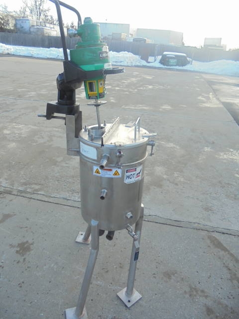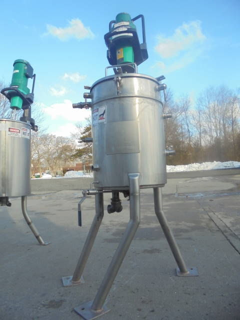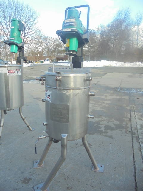 1-Used Watson Metal Masters approx. 10 Gallon Stainless Steel Jacketed Mix Tank, S/N 1910, National Board and Code Stamped. Interior dimensions approx. 10.5 in. diameter X 19 in. deep. Tank has dished bottom and center bottom outlet with hand operated valve and tri-clamp fittings. Jacket rated 150 PSI @ 250 degrees F. Tank has stainless steel agitator mount and can be supplied with Lightnin air Operated Agitator with stainless steel shaft and twin pitched blade, at additional cost. (Stock #8064i)