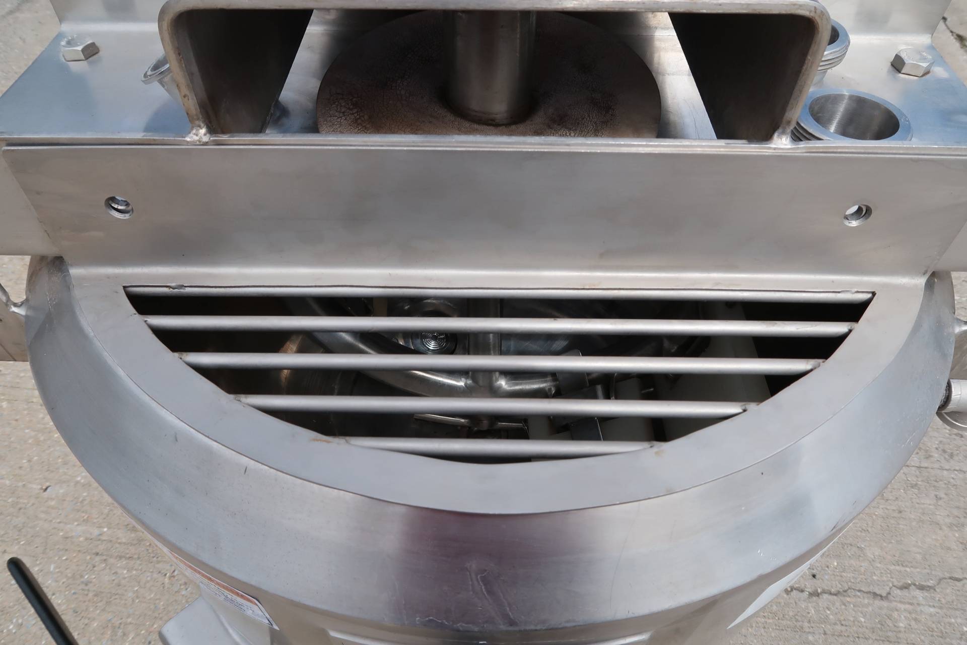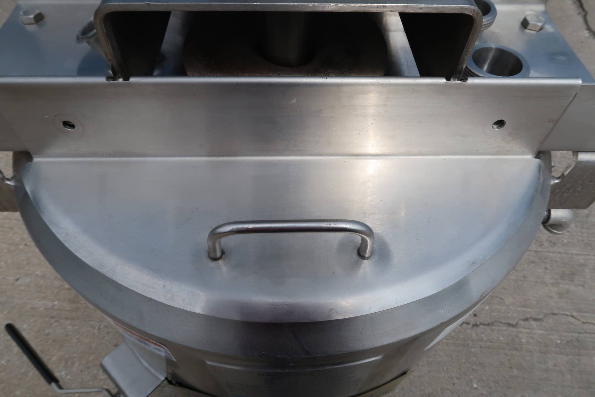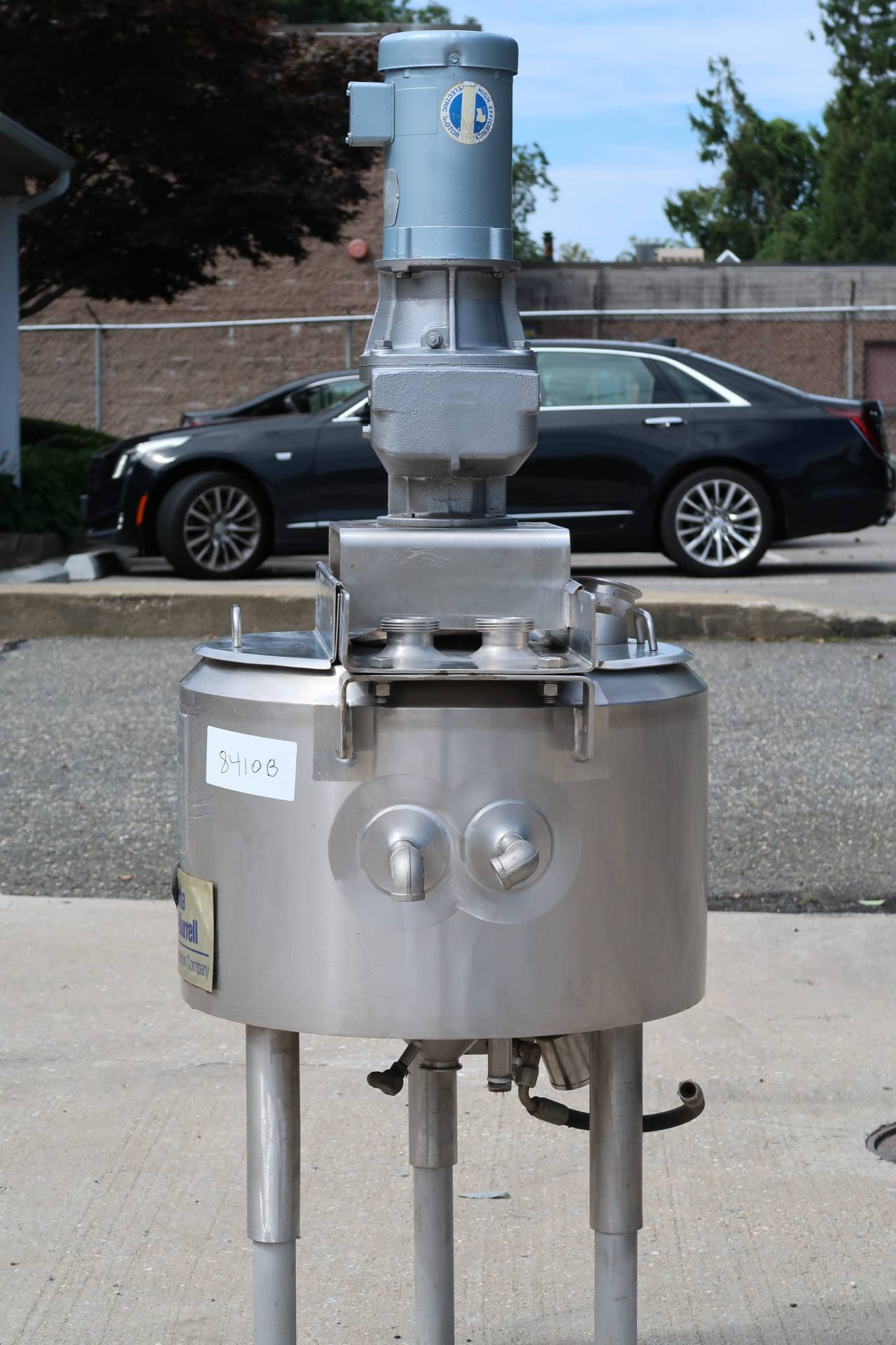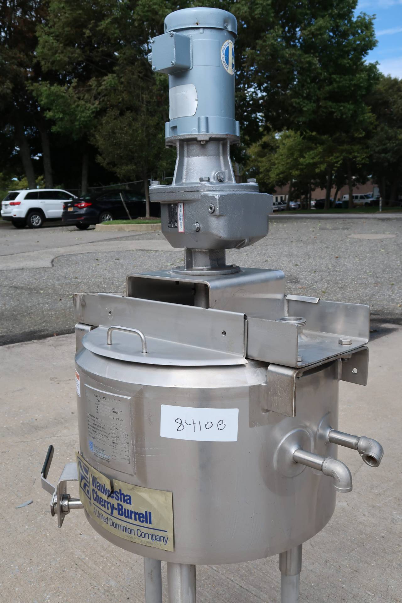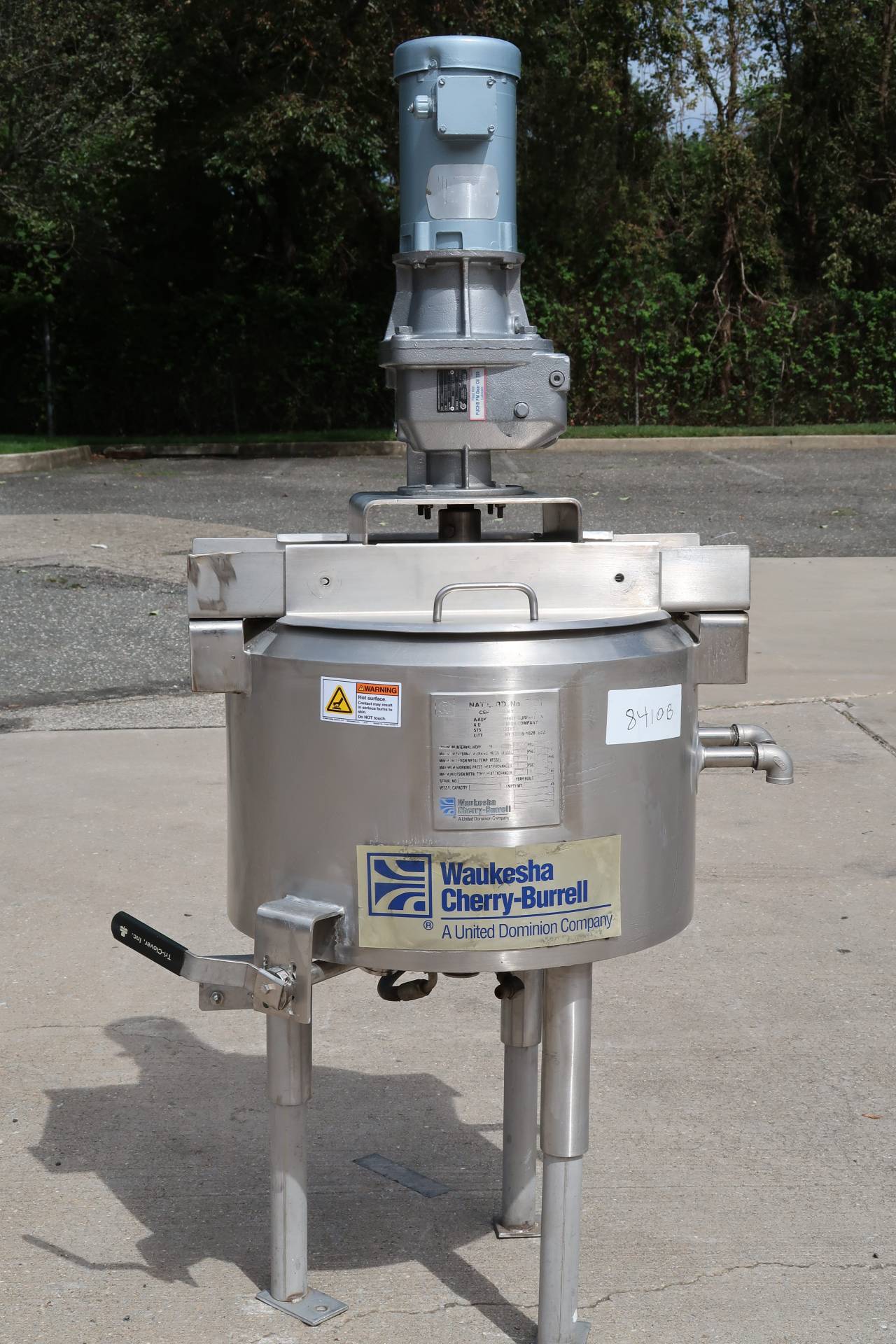1-Used Waukesha Cherry Burrell 10 Gallon 316L Stainless Steel Jacketed Scrape Surface Agitated Mix Kettle, S/N E-222-96. Interior dimensions of this Hemispherically Shaped Kettle measures approx. 20 In. diameter X 15 In. long. Kettle jacketed for 150 PSIG @ 400 Degrees F, National Board # 4541, Code Stamped . With heavy-duty scrape surface agitation with scraper blades. Agitator driven by 1 HP 3/60/208-230-460 volt motor. With temperature Thermowell and stainless steel sectional cover, unit has bottom center discharge with hand-operated valve. Mounted on approx. 21 In. high legs. Kettle was last mixing chocolate product in food industry. (Stock #8410B)