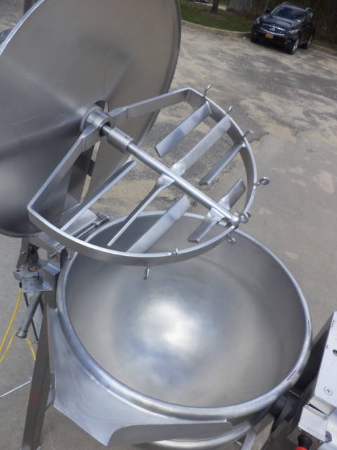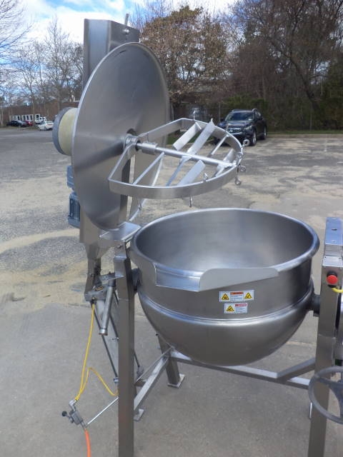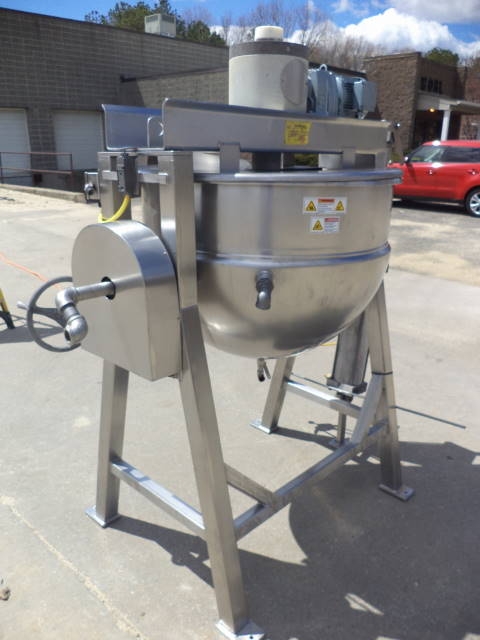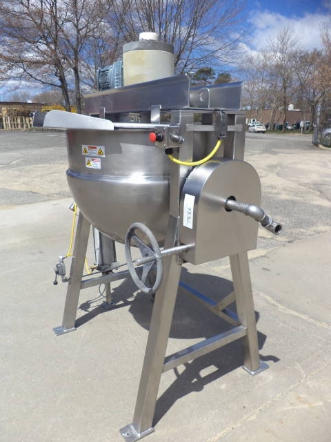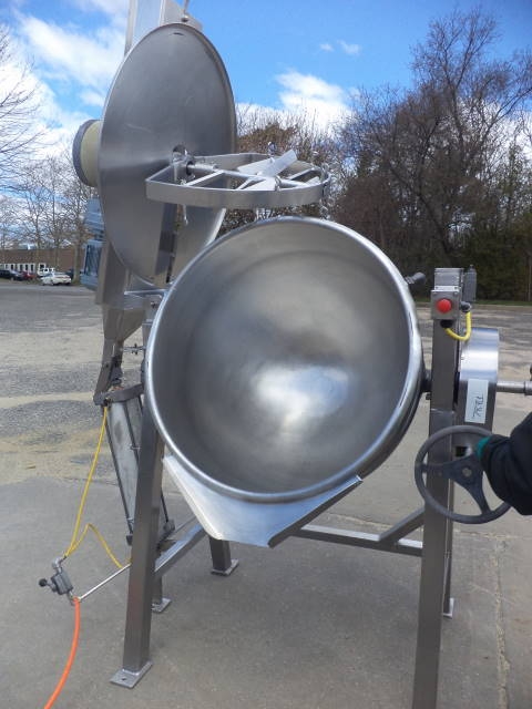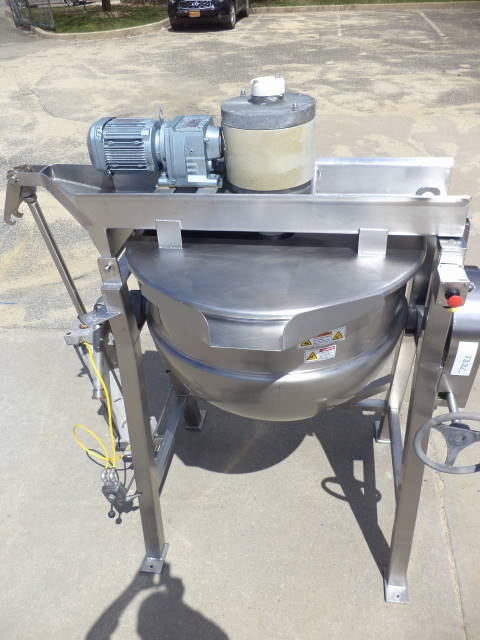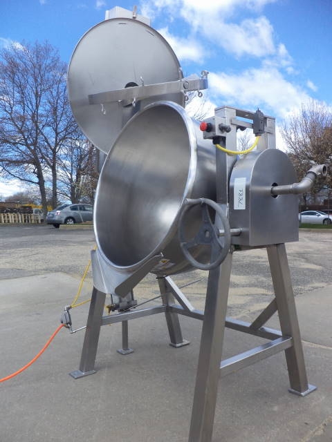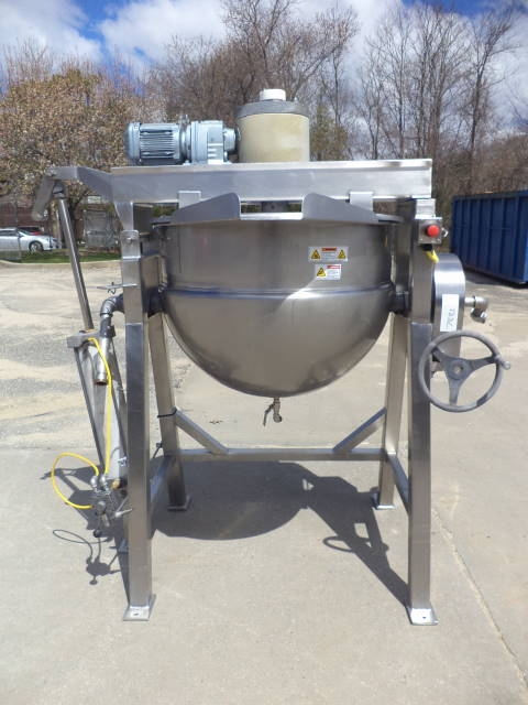 1-Used Hamilton/Trinity Industries 100 Gallon Stainless Steel Jacketed Double Motion Tilt Kettle, S/N D-7386. Kettle dimensions approx. 36 in. diameter X 30 in. deep. Jacket rated 40 PSI @ 267 degrees F, National Board #489, Code Stamped. Equipped with pneumatic cylinder for tilt out of double motion agitation. Kettle has tilt discharge of product via handwheel and double motion agitation driven by EuroDrive 1.5 HP 3/60/230-460 volt motor. Mounted on stainless steel “A” frame, Kettle last used in food production. (Stock 7881)