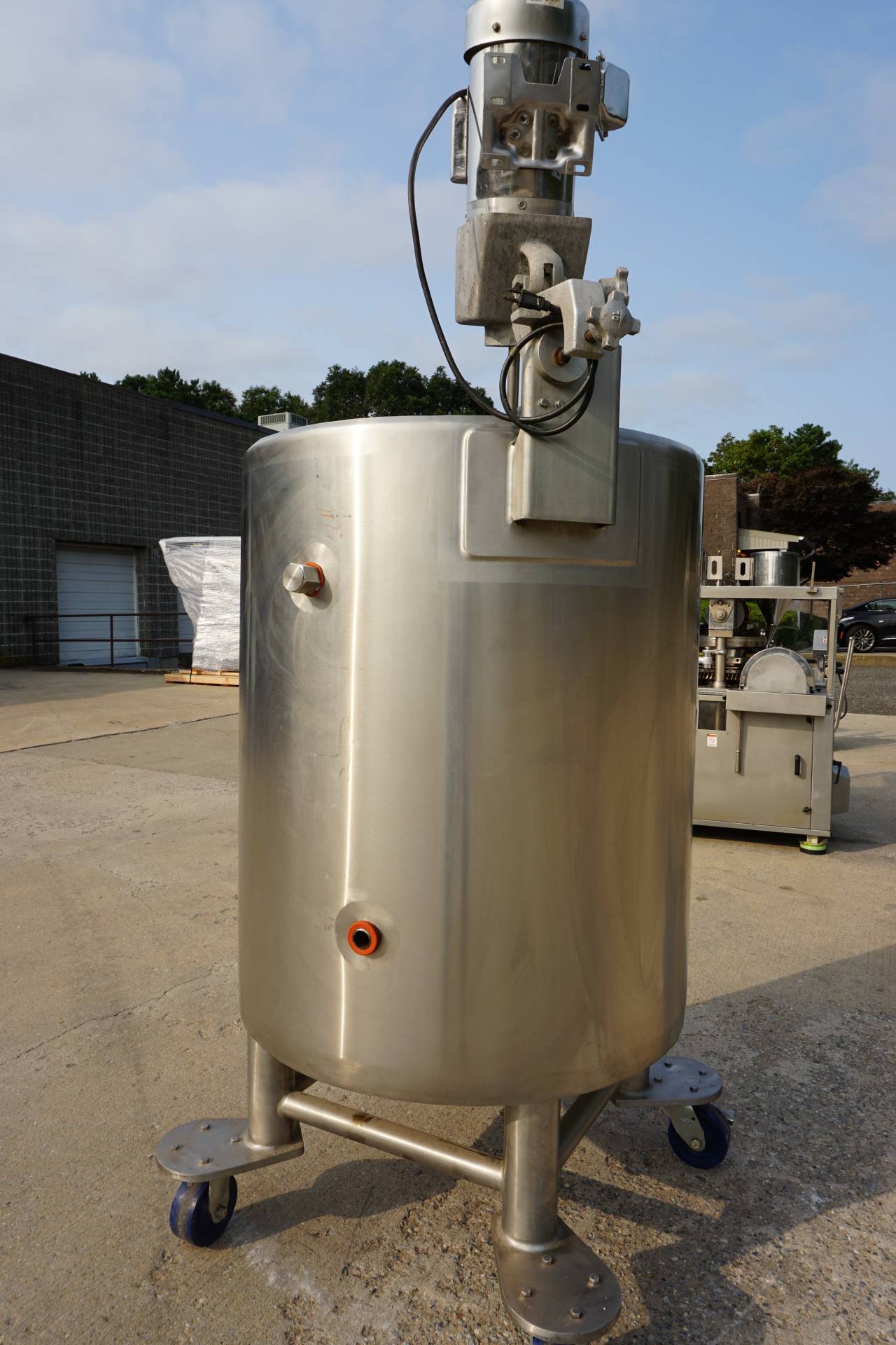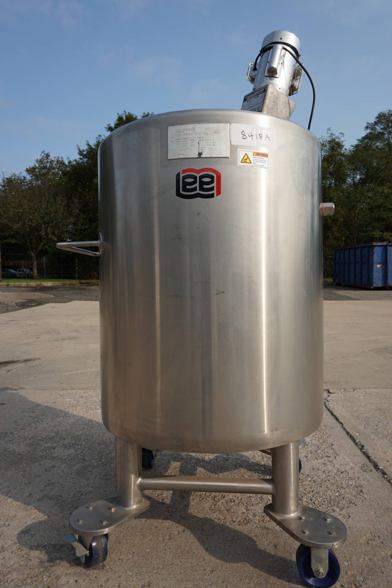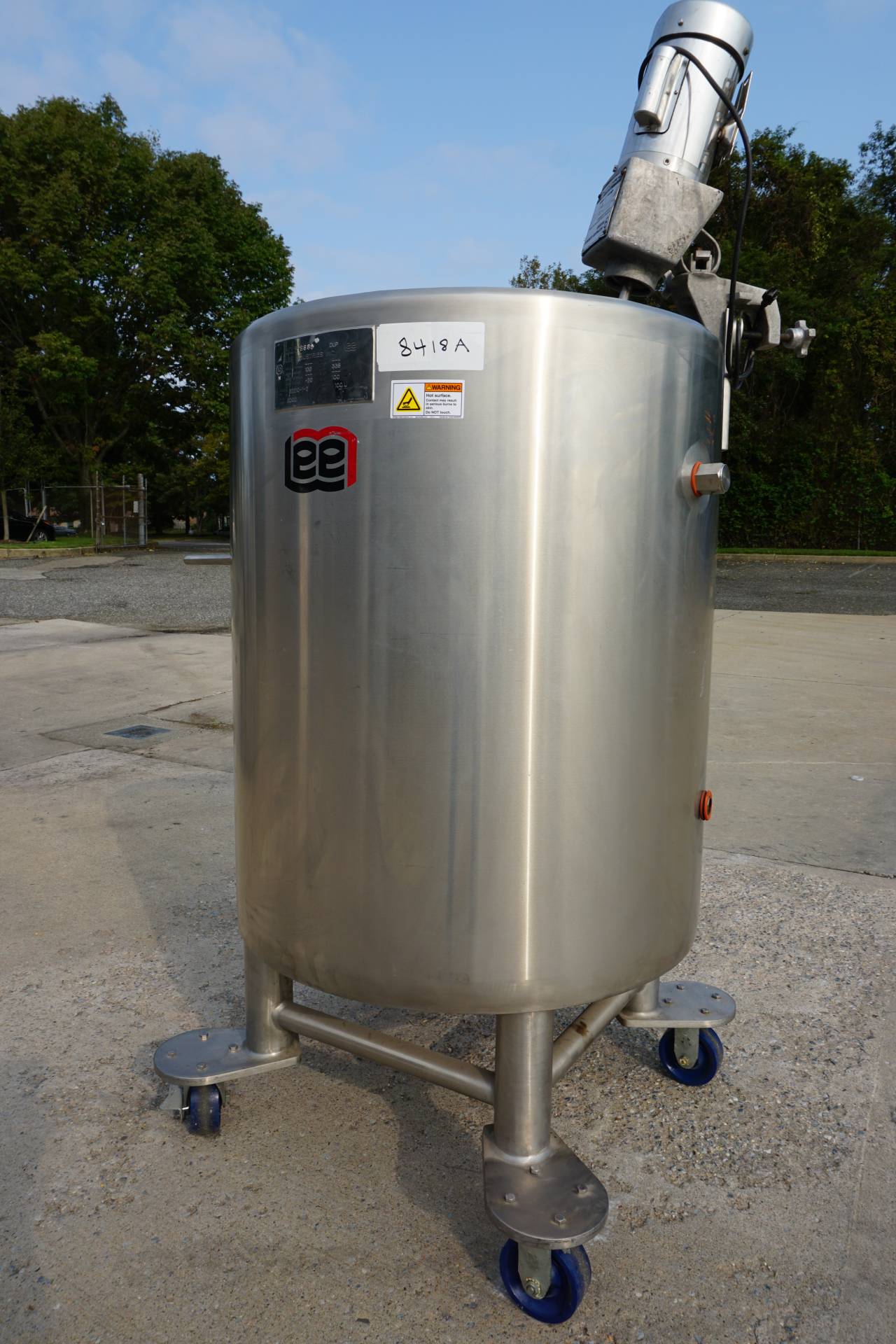 1-Used Lee 100 Gallon Type 316 Stainless Steel Jacketed Mix Tank, S/N 22210-1-2. Interior dimensions 30 In. diameter X 36 In. deep. Jacket rated 100PSI at 338 Deg. F., National Board number 8889, code stamped. Equipped with dished bottom with approx. 2 In. diameter center-bottom outlet with valve, tank is mounted on Stainless steel legs with casters for portability. With “push-bar” for easy transport, Tank has stainless steel agitator mount and clamp-on top entering propeller agitator. Last used in the pharmaceutical industry. (Stock #8418A)
