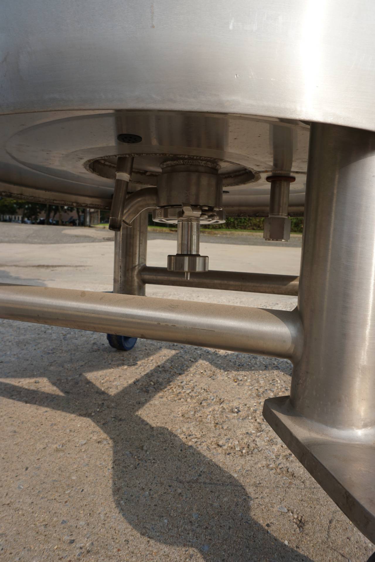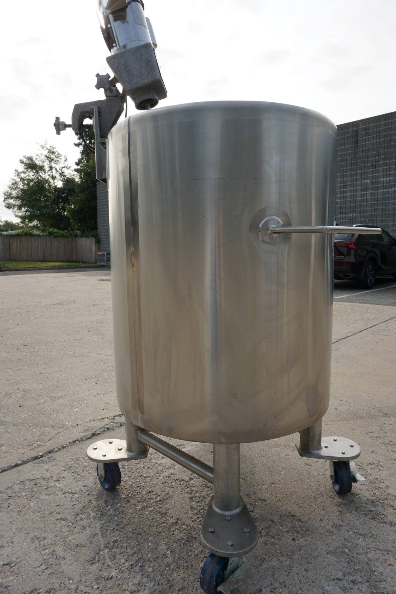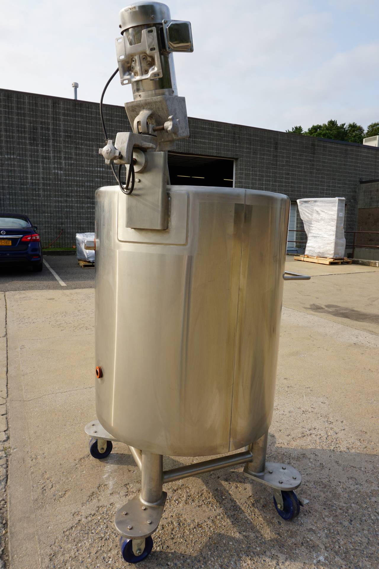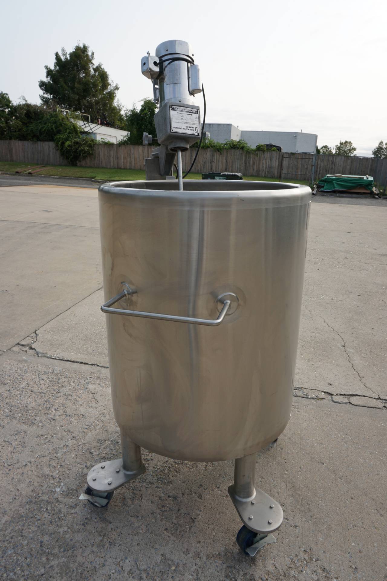 1-Used Lee 100 Gallon Type 316 Stainless Steel Jacketed Mix Tank, S/N 22210-1-2. Interior dimensions 30 In. diameter X 36 In. deep. Jacket rated 100PSI at 338 Deg. F., National Board number 8889, code stamped. Equipped with dished bottom with approx. 2 In. diameter center-bottom outlet with valve, tank is mounted on Stainless steel legs with casters for portability. With “push-bar” for easy transport, Tank has stainless steel agitator mount and clamp-on top entering propeller agitator. Last used in the pharmaceutical industry. (Stock #8418A)
