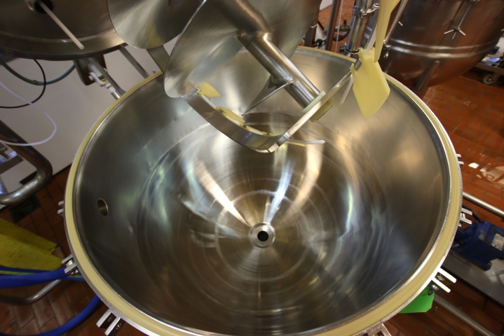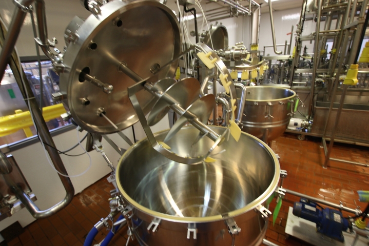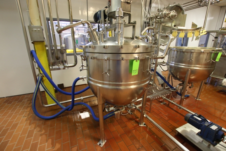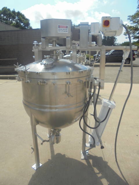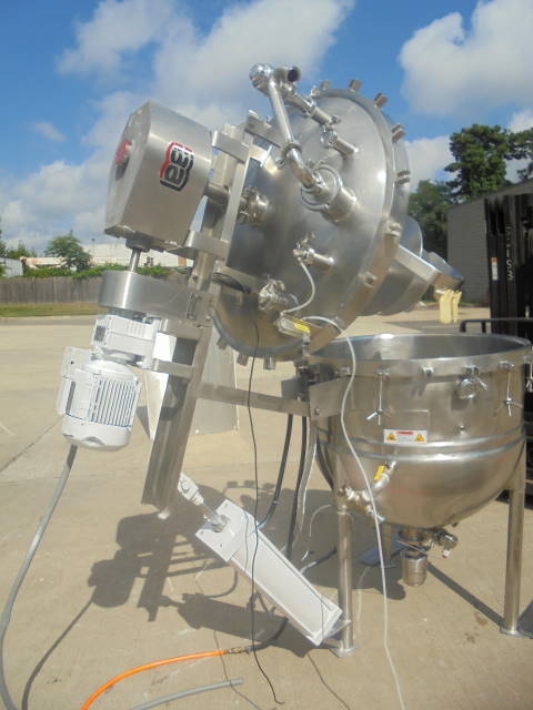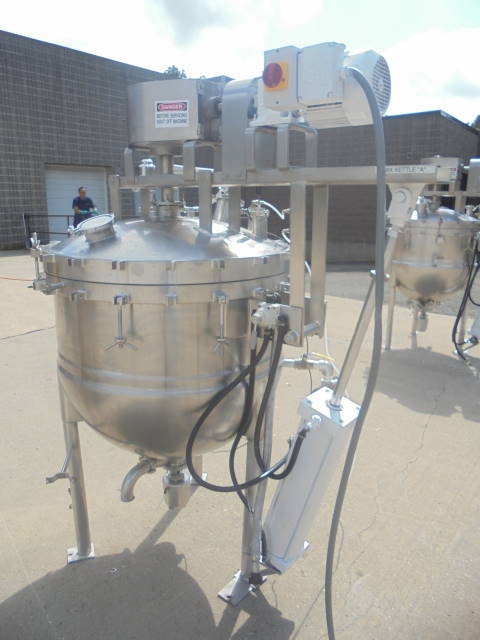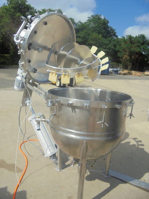 1-Used Lee 100 Gallon Stainless Steel Dual Action Jacketed Vacuum Mixing Kettle Model 100D9MT, S/N A-7863-1. Rated 90 PSI jacket @ 332 degrees F, Kettle is also internally rated 40 PSI and full vacuum, National Board # 2961, Code Stamped. With tilt out agitation via air actuated self contained cylinder, Kettle has top mounted Eurodrive motor for the scraped surface agitation, as well as for the center screw agitation. Screw is desirable for deaeration of viscous products. Vessel has bottom outlet with automatic valve. Top head of kettle has six assorted openings. (Stock #8124B)