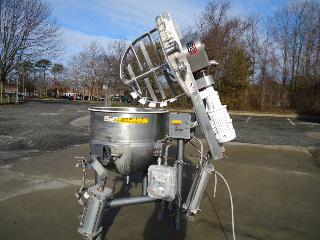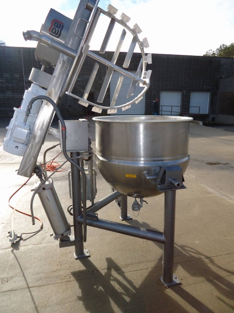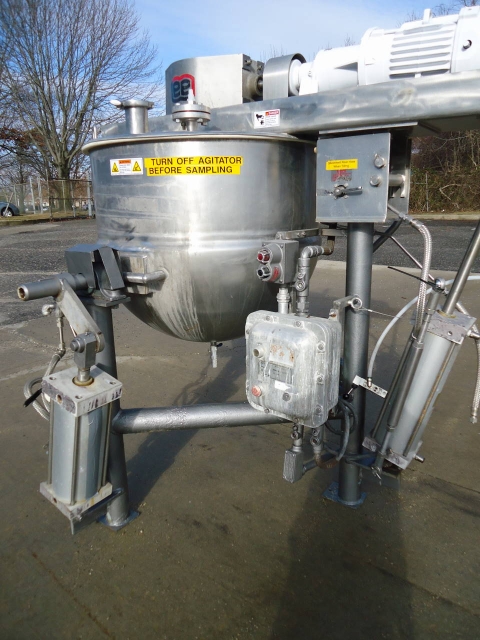 1-Used Lee 100 Gallon Type 316 Stainless Steel Jacketed Double Motion Mixing Kettle Model 100CHD9MT, S/N C2783A. Kettle body dimensions approx. 36 in. diameter X 30 in. deep, Kettle has double motion agitation driven by 3 HP explosion proof motor. Also equipped with explosion proof starter box. Kettle has “tilt out” cylinder for tilt out of agitation assembly, as well as secondary cylinder for tilt discharge of Kettle. Equipped with Thermowell for temperature, along with explosion proof device, Kettle on legs and stainless steel lids (Stock #7866B)