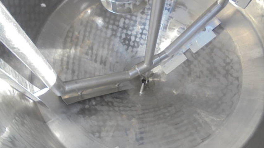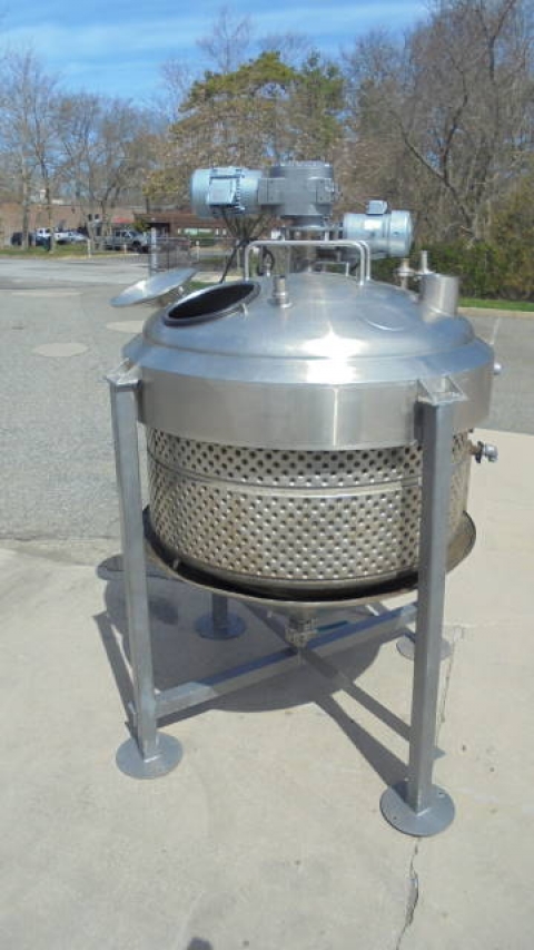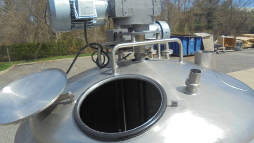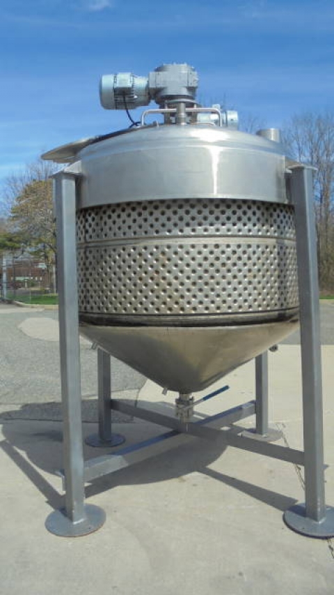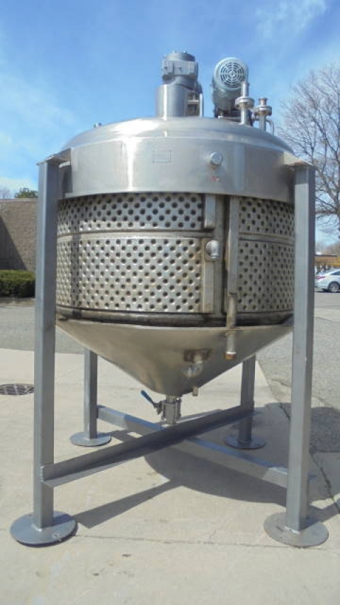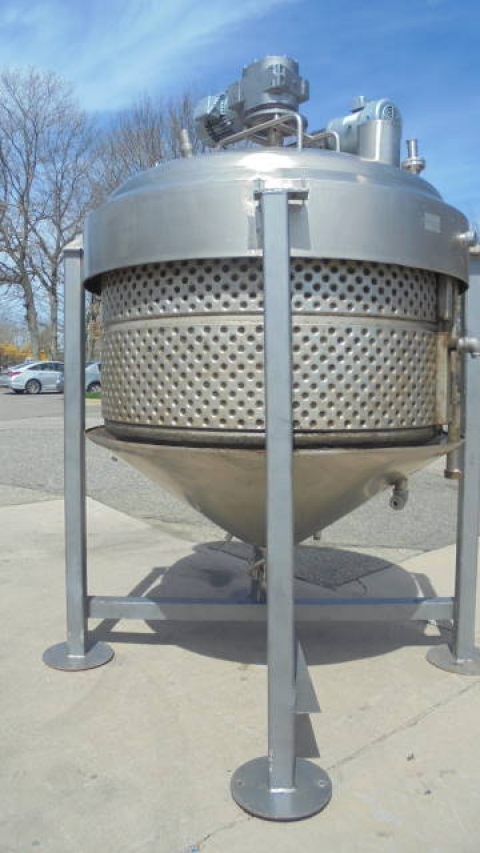 1-Used Crepaco Approx. 1,000 Gallon Stainless Steel Jacketed Dual Action Process Vessel, S/N B-2098. Interior dimensions approx. 78 In. inside diameter X 42 In. on straight side, plus 19 In. deep cone bottom. Vessel has dished top head with 18 In. off-center manway with lid and assorted smaller inlets. Dual action agitation consists of scraper agitator, as well as off-center high shear disperser head. With cone bottom with approx. 3 In. diameter center bottom discharge, vessel has 5 HP 3/60/208-230/460 volt top mounted motor for high speed dispersion mixer, and 3 HP 3/60/230-460 volt motor for scraped surface agitation. (This vessel has leaks in dimple jacket and repair of the leaks would be the responsibility of the purchaser). (Stock #8174D)