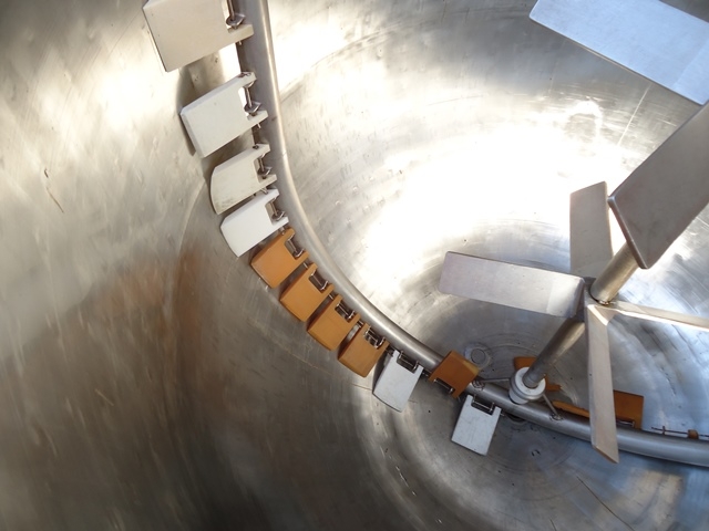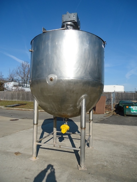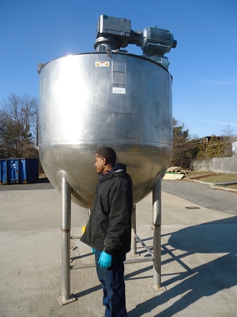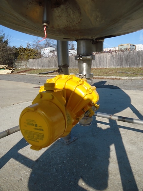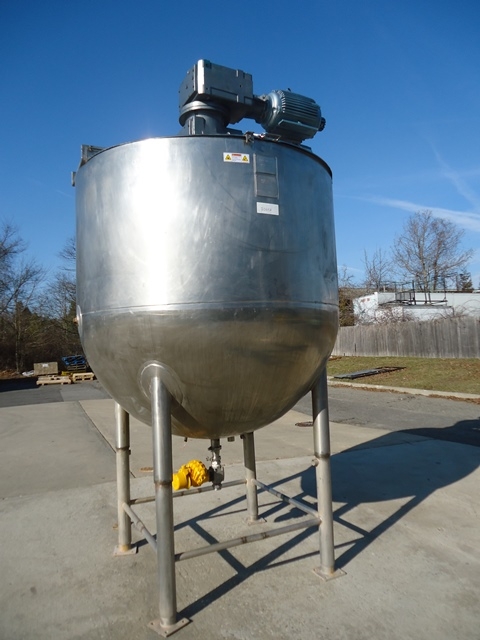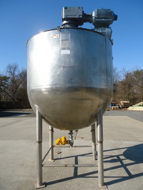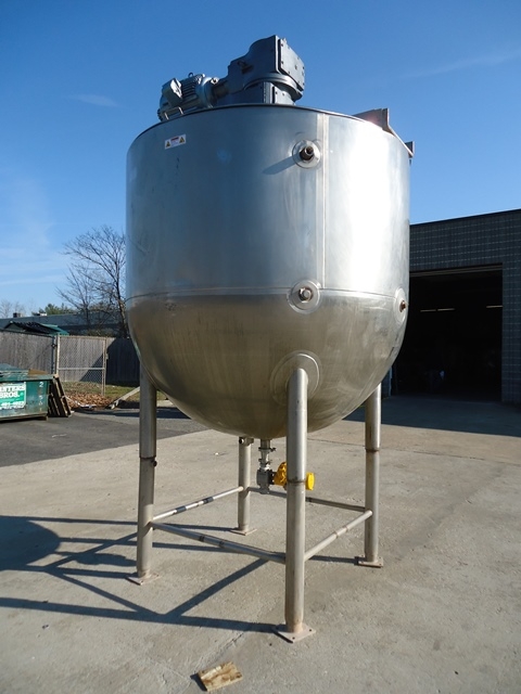 1-Used Paul Mueller Company Approx. 1,000 Gallon Stainless Steel Jacketed Hemispherical Dual Action Mixing Kettle, Serial P5678-1. Dimensions approx. 72 in. diameter by 74 in. deep, kettle is rated 40 PSI jacket @ 300 Deg. F, code stamped. Equipped with scraped surface agitation, as well as approx. 28 in. wide pitched bladed agitator, driven by 10 HP and 20 HP motors and gearboxes. On legs, kettle has hinged lids, and center bottom outlet with approx. 3 in. tri-clamp outlet with diaphragm valve. (Stock #8064A)