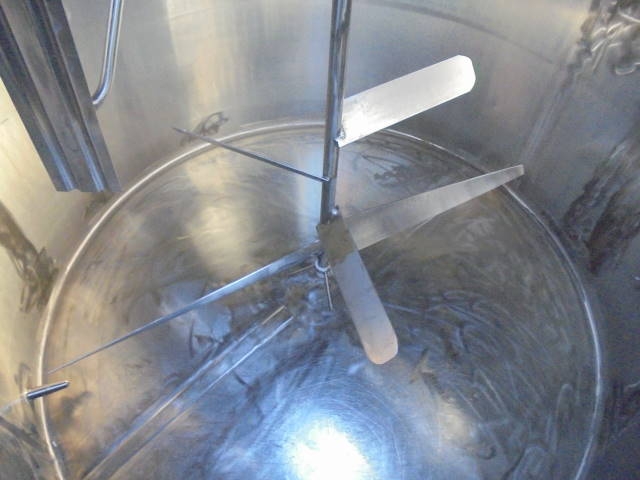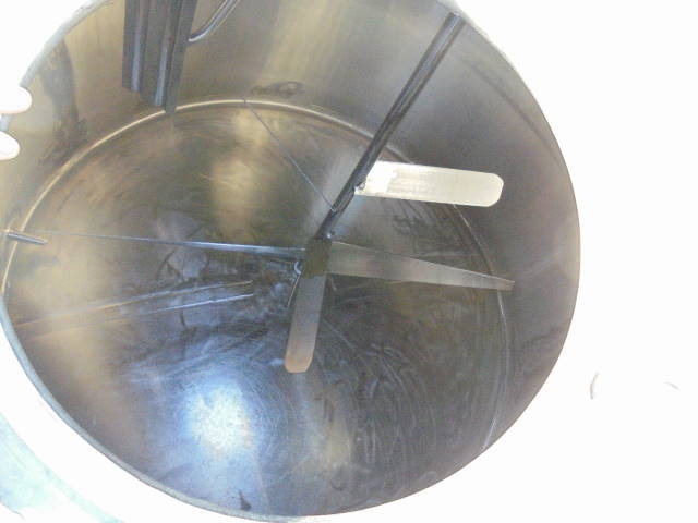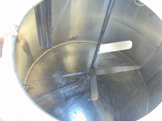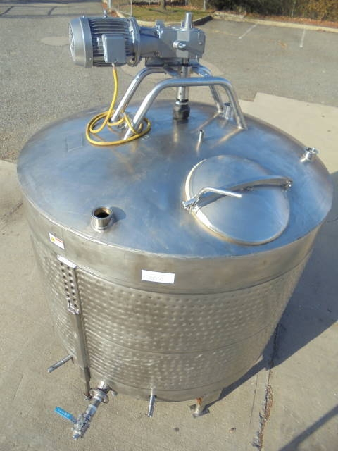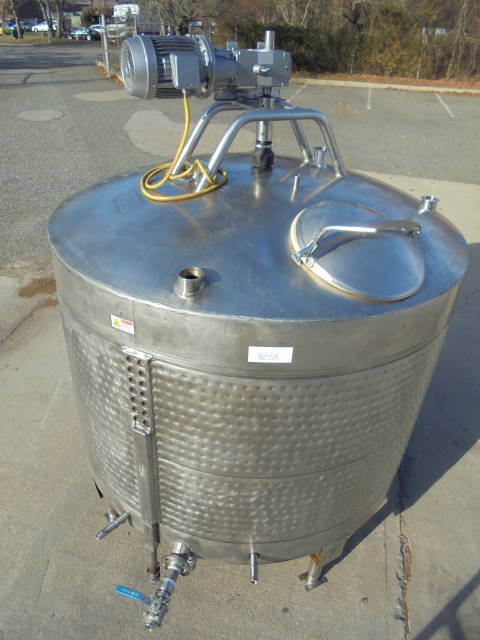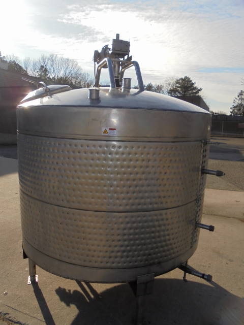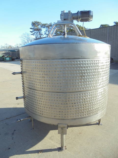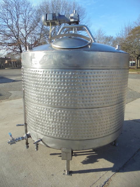1-Used 1,000 Gallon Stainless Steel Dimple Jacketed Vertical Mix Tank. Interior dimensions approximately 80 in. diameter x 56 in. on straight side. With dished top, tank has 18 in. diameter off-center top manway with hinged lid. With sweep agitation with paddles, driven by 2HP/1HP 3/60/460volt two speed motor. With internal baffle, tank has sloped bottom with side bottom discharge. Last used in yogurt processing, tank is on approximately 18 inch high legs. Tank has leaking jacket, so it is being sold “as is”. Buyers responsibility to repair jacket (Stock # 8059)