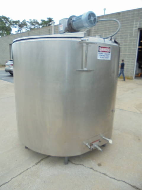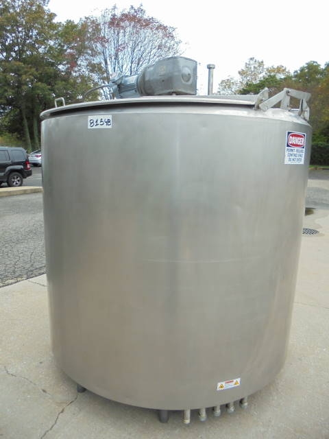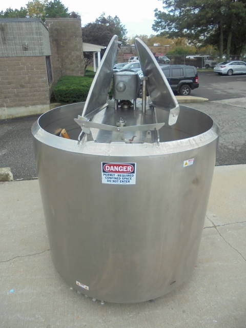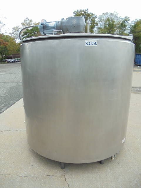 1-Used approx. 1,000 Gallon Stainless Steel Jacketed Agitated Processor. This Jacketed Mixing Tank measures approx. 72 in. diameter X 64 in. straight side plus sloped bottom. Half pipe jacket covers both sides and bottom head and there is outer insulation shroud on top of jacket. Equipped with bottom sweep agitation and partial side scraper agitation driven by 5 HP 3/60/208-230-460 volt motor. With hinged lids, Tank has internal stationery baffle and approx. 1-1/2 in. diameter discharge. (Stock #8154B)