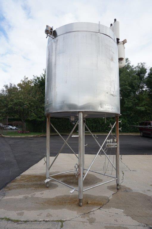 1- Used Cherry Burrell Approx. 1,200 Gallon Stainless Steel Jacketed Vertical Closed Tank, S/N E-579-88-2. Interior dimensions approx. 72 In. diameter X 84 In. Deep. Tank has dished top head with 18 In. diameter manway with lid and quick opening bolts. Last used in food manufacturing, Tank has dished bottom internally and has approx. 3 In. diameter center bottom outlet. With C.I.P. spray ball, tank is on 60 In. High stainless steel legs. (Stock #8554C)