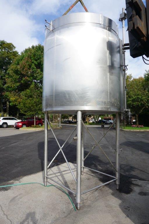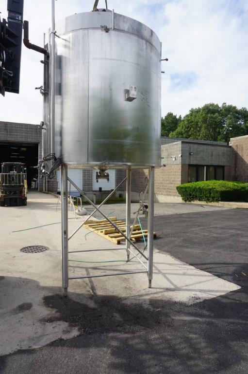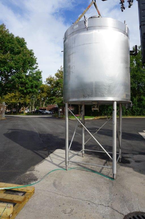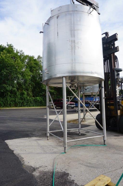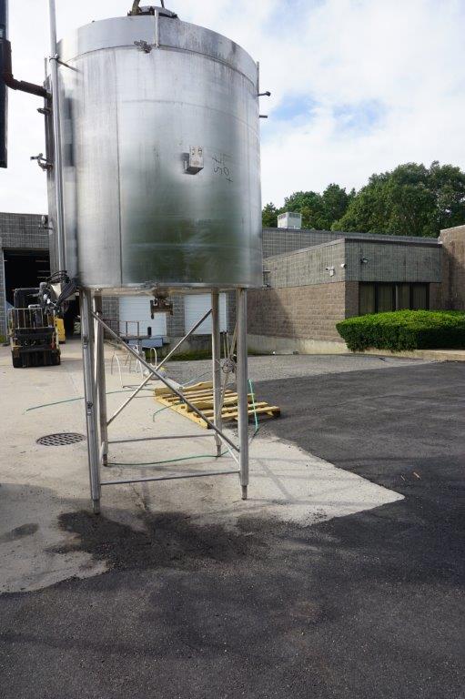 1-Used Cherry Burrell Approx. 1,200 Gallon Stainless Steel Jacketed Vertical Closed Tank, S/N E-579-88-1. Interior dimensions approx. 72 In. diameter X 84 In. Deep. Tank has dished top head with 18 In. diameter manway with lid and quick opening bolts. Last used in food manufacturing, tank has dished bottom internally and has approx. 3 In. diameter center bottom outlet. With C.I.P. spray ball, tank is on 60 In. High stainless steel legs. (Stock #8554K)