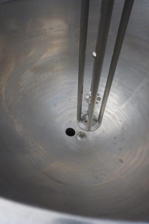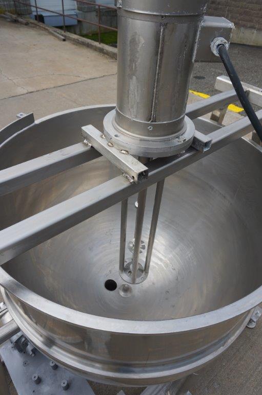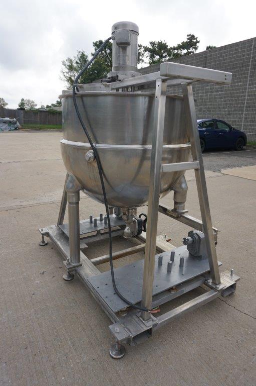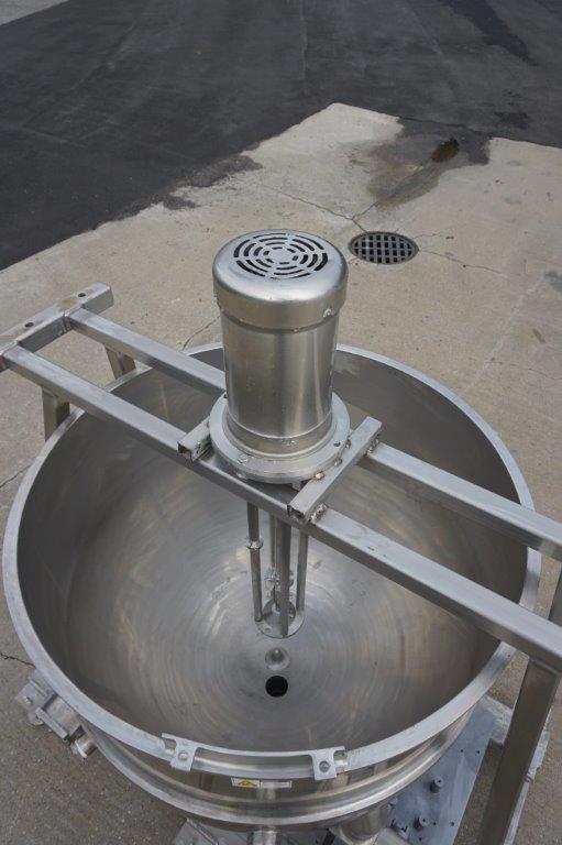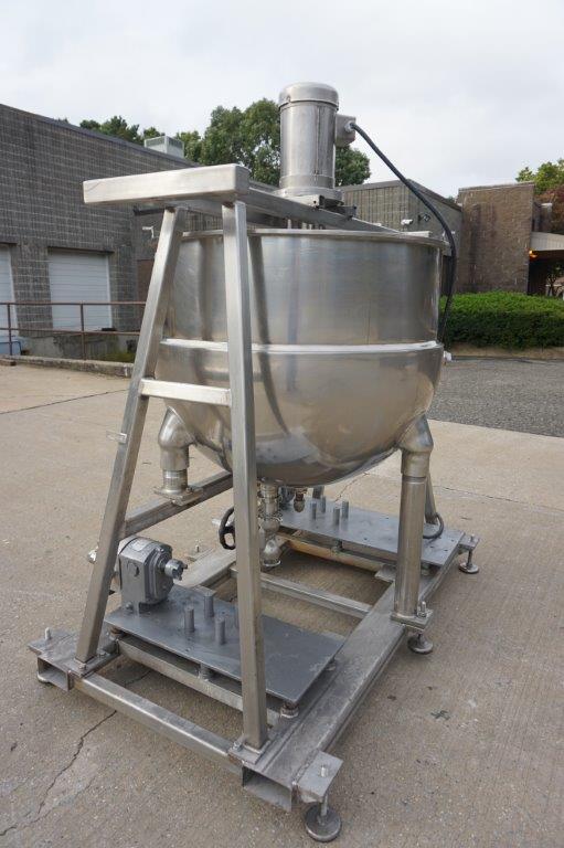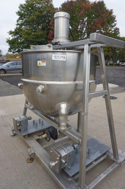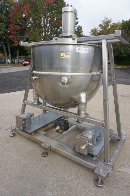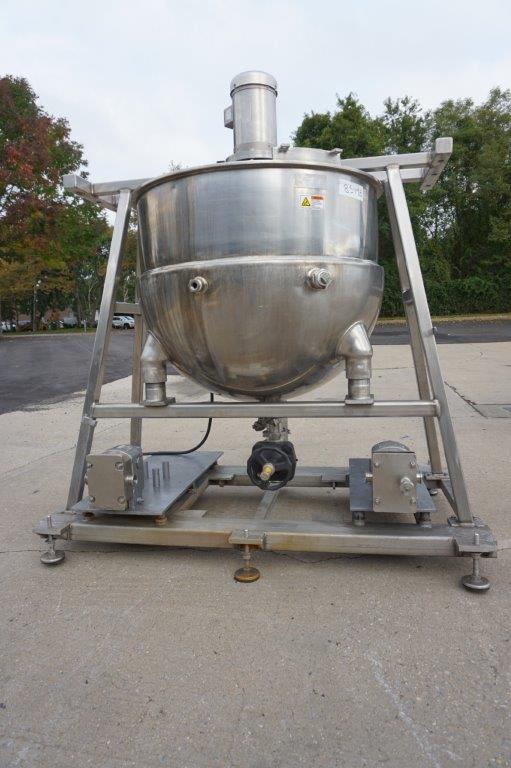 1-Used Groen 150 Gallon Stainless Steel Jacketed Hemispherical Kettle. Dimensions 42 In. Diameter X 34 In. Deep, Kettle is jacketed for 125 PSI at 353 Deg. F., National Board #95143, Code Stamped. Mounted on stainless steel “A” frame with base, kettle has approximately 3 In. diameter bottom outlet with tri-clamp fitting and hand operated discharge valve. Presently equipped with two Crepaco positive displacement pumps, without motors, as shown in photos below. Also equipped with high speed homogenizer mixer driven by bridge mounted 3HP 3/60/230-460 volt 3,450RPM motor. Can be equipped with clamp on propeller mixer at additional cost (Stock # 8549B)