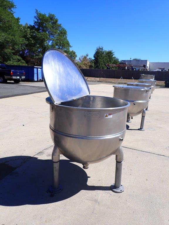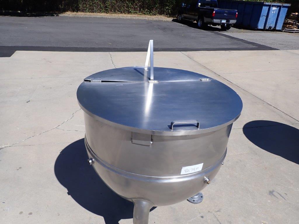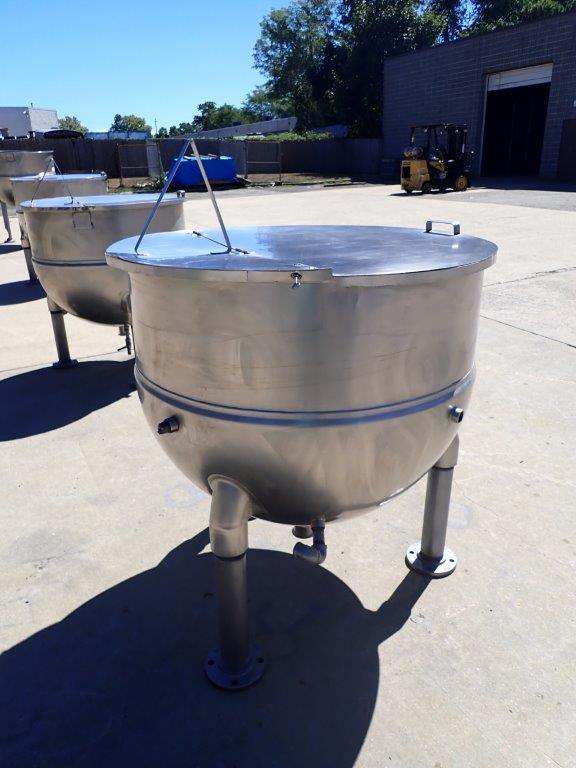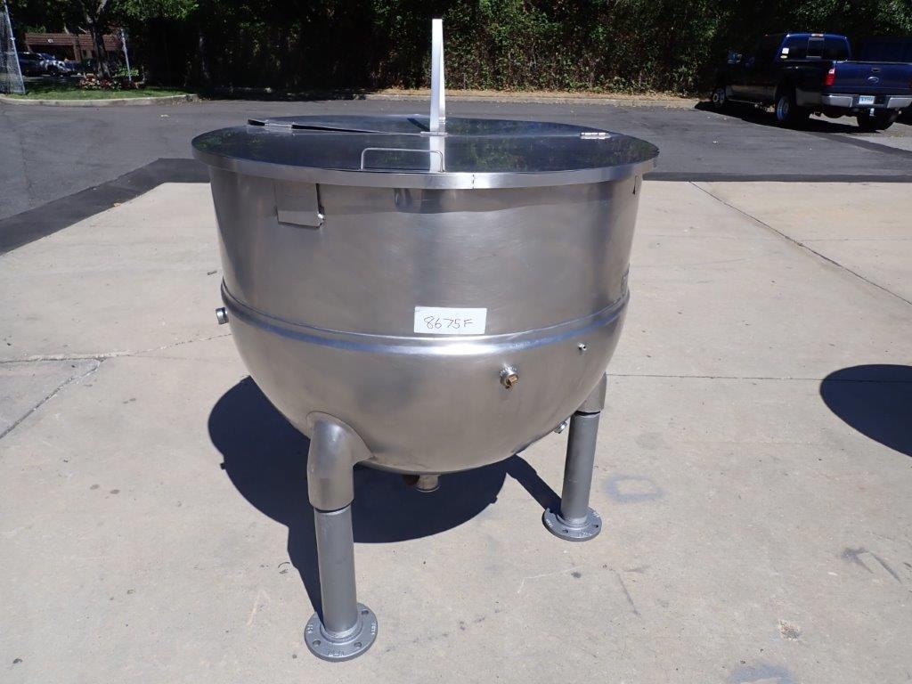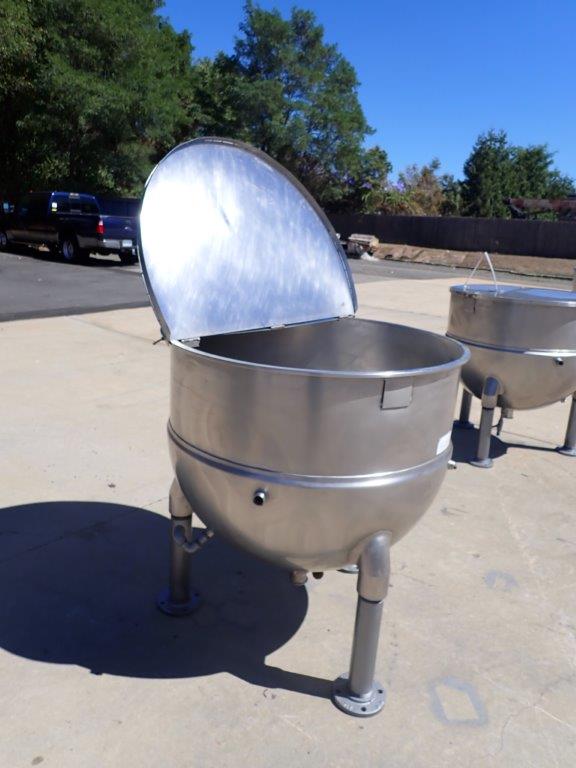 1-Used Groen 150 Gallon Stainless Steel Jacketed Hemispherical Kettle. Dimensions 42 In. Diameter X 34 In. Deep. Jacket designed for 45 PSI @300 Deg. F, National Board number 43376, Code Stamped. Equipped with 3 In. diameter bottom outlet with Tri-clamp fitting. On 18 In. high legs, kettle last used in the food industry, kettle equipped with stainless steel lid (Stock #8675F)
