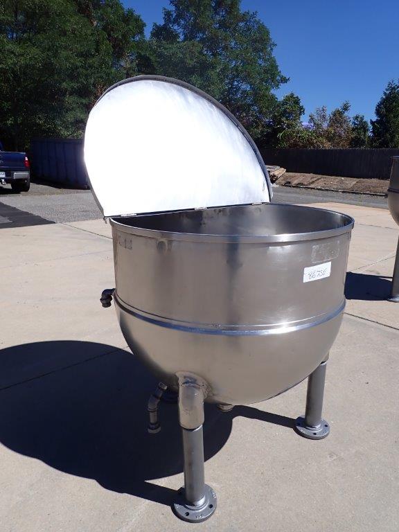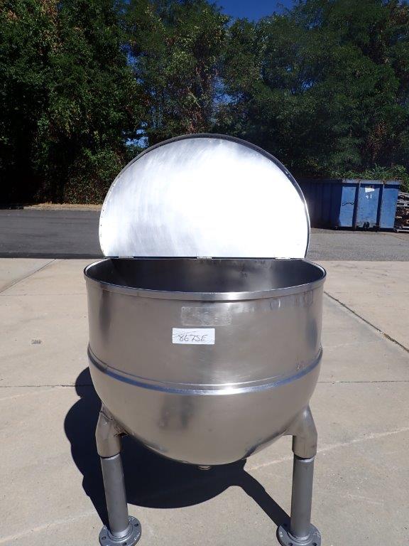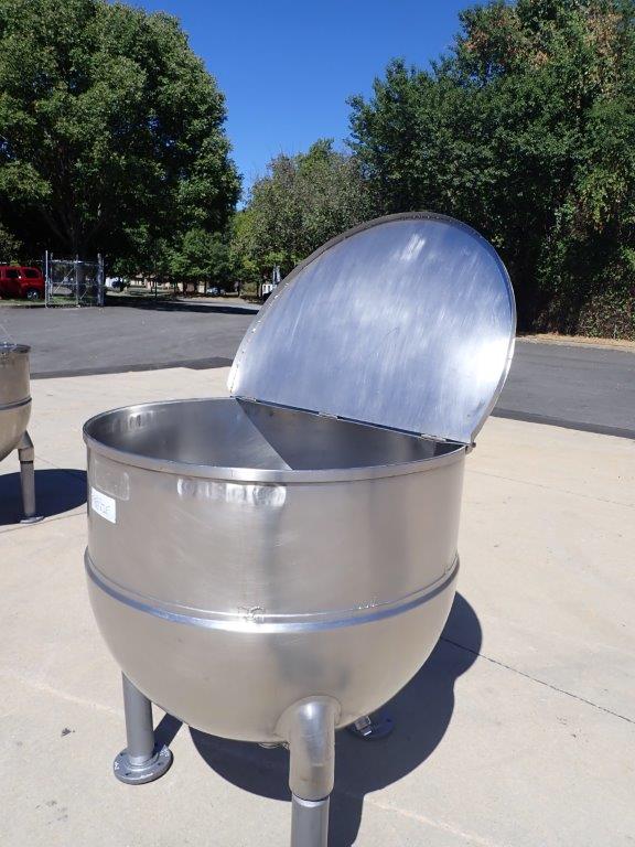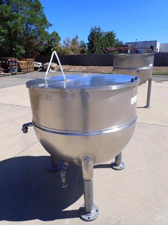 1-Used Groen 150 Gallon Stainless Steel Jacketed Hemispherical Kettle. Dimensions 42 In. diameter X 34 In. Deep. Equipped with 3 In. diameter bottom outlet with Tri-Clamp fitting. On 16 In. high legs, kettle last used in food industry, equipped with stainless steel lid (Stock #8675E)