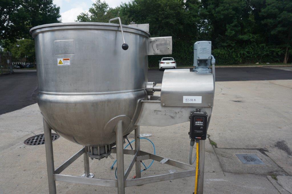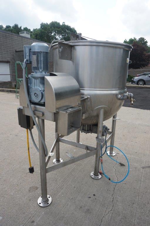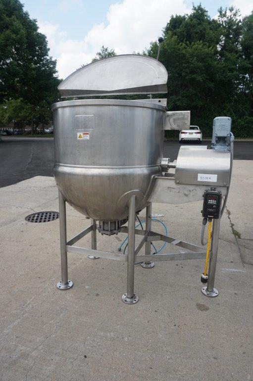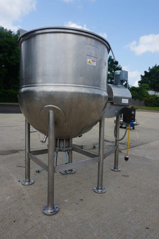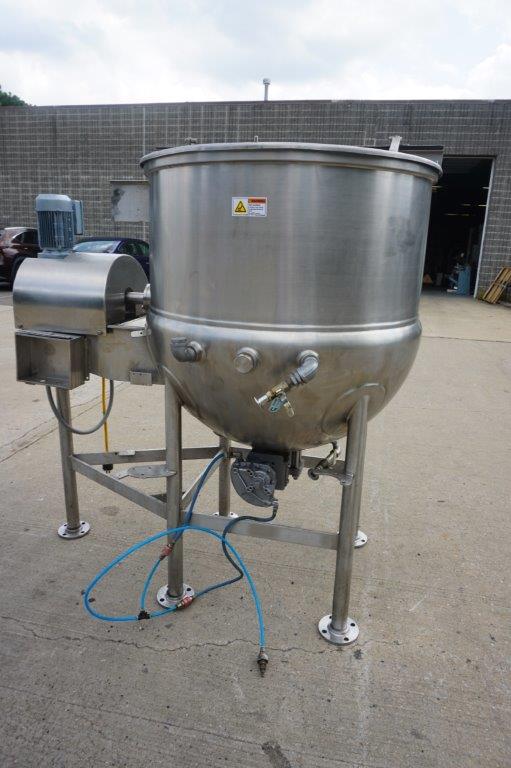 1-Used J.C. Pardo & Sons Approximately 150 Gallon Type 316 Stainless Steel Jacketed Kettle, Serial Number 5855-2. Interior dimensions approximately 40 In. diameter X 42 In. Deep, Kettle is jacketed for 90 PSI@ 331 Deg. F., National Board number 2478, Code Stamped. Equipped with horizontal scraped surface agitation , kettle has Eurodrive motor drive and Genesis Variable Frequency drive with 230/460 Volt electrics. With approximately 4 In. diameter bottom center discharge with Tri clamp fitting and air operated discharge valve. On approximately 36 In. stainless steel legs, kettle has hinged lid and was last used in the food industry. (Stock #8538B)