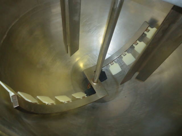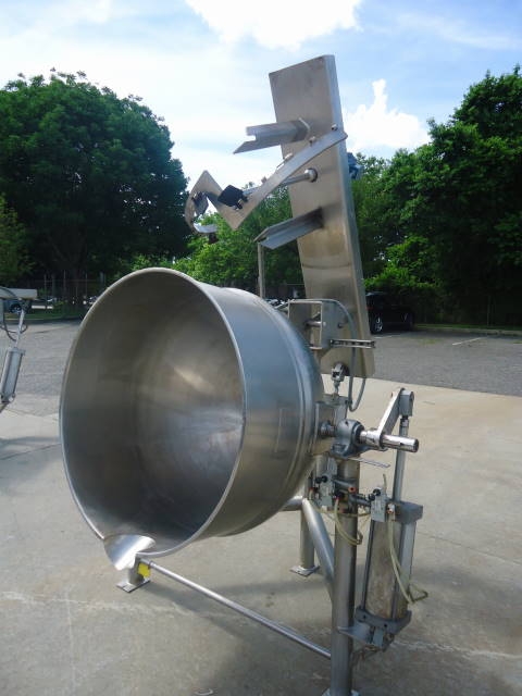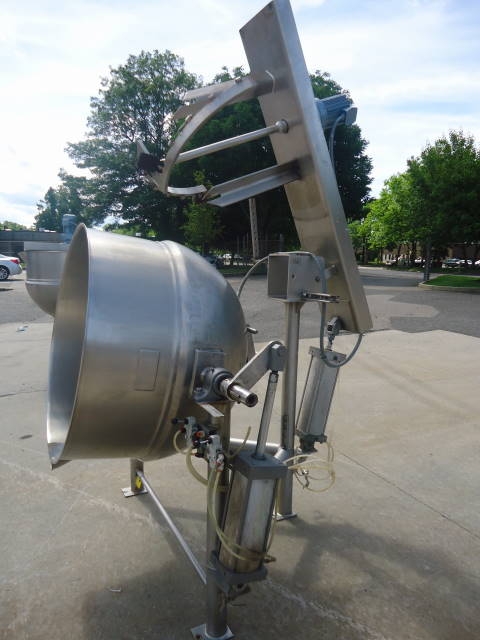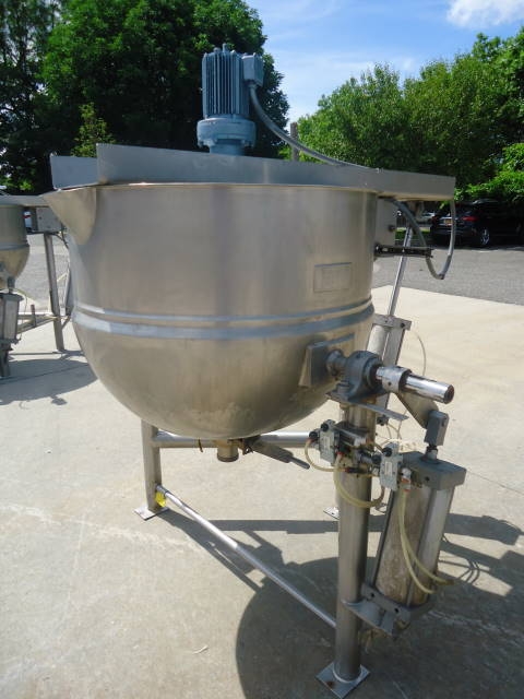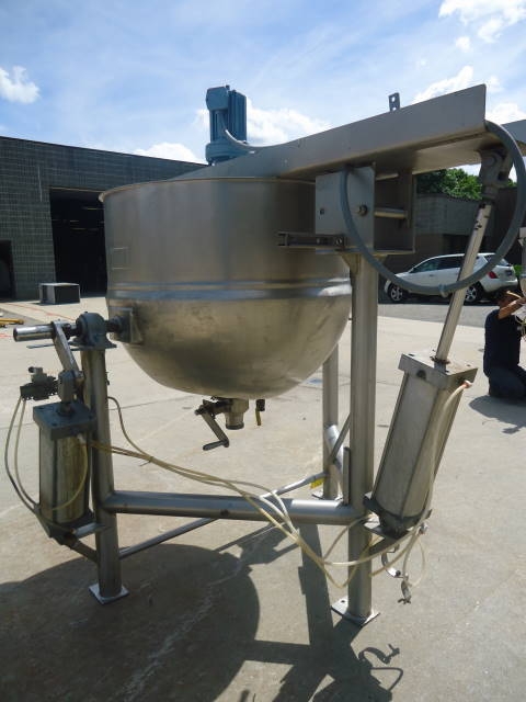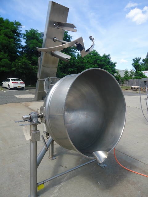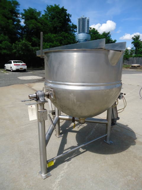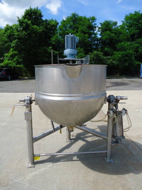 1-Used lee 150 gallon 316 stainless steel jacketed scraper agitated kettle, model 150chd7t, serial number b5691b3. Dimensions approximately 42 inch diameter by 36 inch deep. Equipped with scraped surface agitation, as well as vertical baffles. Kettle has pneumatic cylinder for tilting the kettle for discharge as well as secondary pneumatic cylinder for automatic “tilt out” of agitation assembly. Also equipped with bottom discharge which measures approximately 4 inch diameter, but is equipped with “fluid flow” valve, terminating in a 3 inch discharge. Jacket is rated 125 psi at 353 degrees f., national board number 4960, code stamped. With top mounted motor, kettle is on stainless steel legs. (stock#7801c)