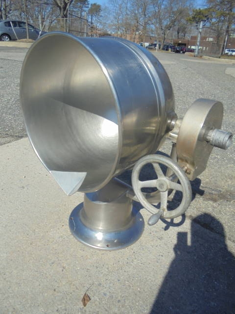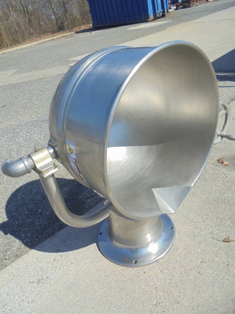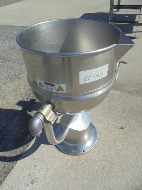 1-Used Groen 20 Gallon Stainless Steel Jacketed Tilt Kettle. Dimensions approx. 20 in. diameter x 18 in. deep, kettle is jacketed for 40 PSI @ 300 Deg. F., National Board # 13634, Code Stamped. Kettle has pouring lip and hand wheel for tilt discharge. (Stock #8074D)