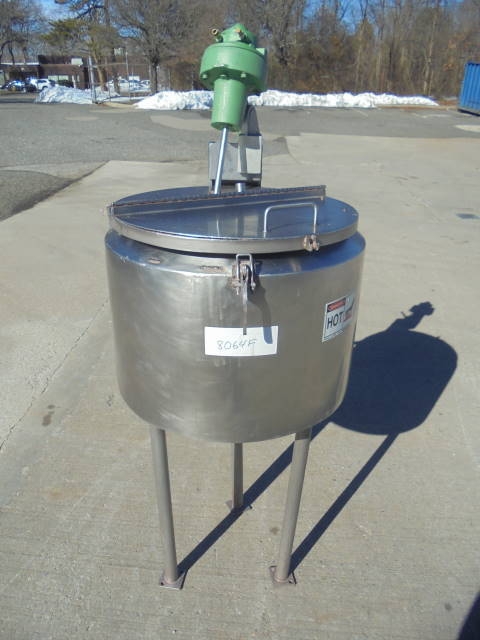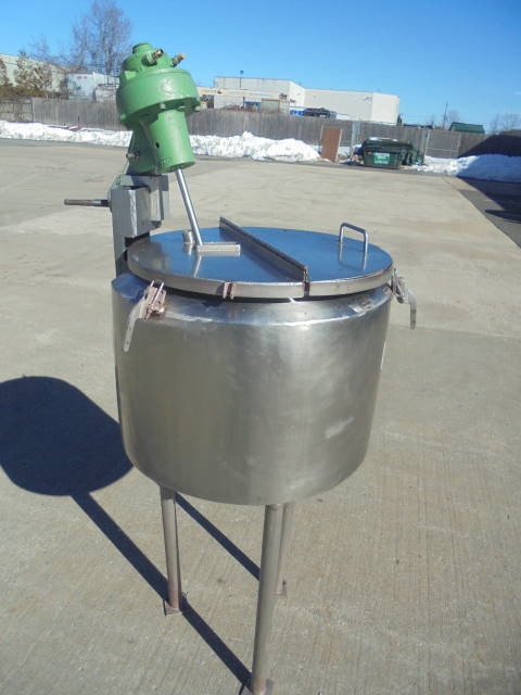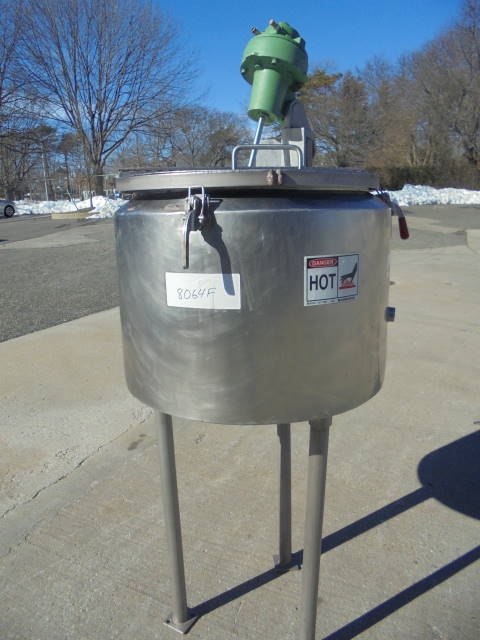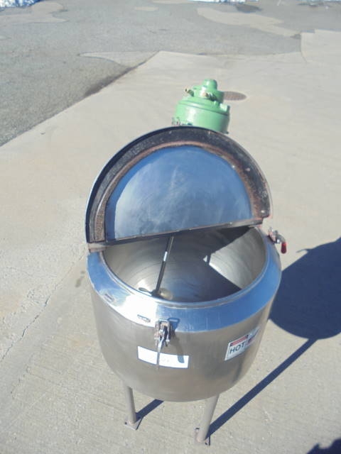 1-Used Approximately 20 Gallon Stainless Steel Jacketed Kettle. With hemispherical interior, kettle measures 20 in. interior diameter x 18 in. deep. Equipped with approx. 1-1/2 in. diameter center bottom outlet, with hand operated ball valve. With stainless hinged lid, kettle is on approx. 31 in. high legs. With agitator mount. (Agitator available at an additional cost.) (Stock # 8064F)