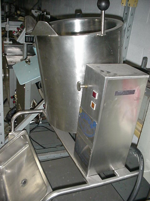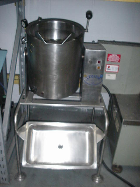 1-Used legion model teh-20 qt. Stainless steel self-contained electric tilt kettle, serial #870259. Mounted on stainless steel table, with discharge tray w/outlet, kettle measures 14″ diameter by 10″ deep. Jacket rated 45 psi @ 290 deg.f.