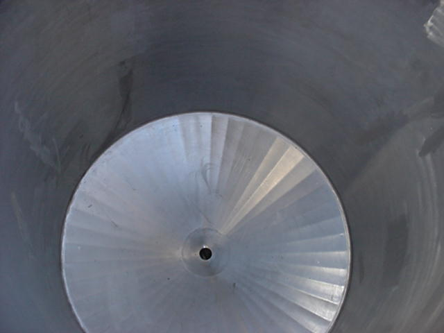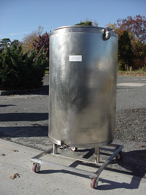 1-USED B&G APPROX. 200 GALLON STAINLESS STEEL VERTICAL JACKETED AND INSULATED TANK. DIMENSIONS APPROX. 38″ DIAMETER X 48″ ON STRAIGHT SIDE. TANK HAS CONE BOTTOM INTERNALLY AND AN APPROX. 1-1/2″ DIAMETER CENTER BOTTOM OUTLET ARRANGED FOR TANGENTIAL DISCHARGE. WITH LID, TANK IS MOUNTED ON 36″ WIDE X 44″ LONG STAINLESS STEEL PORTABLE BASE WITH CASTERS.