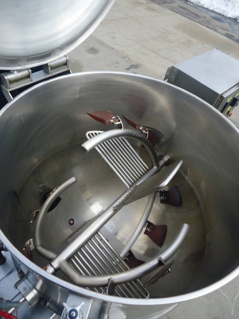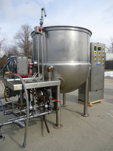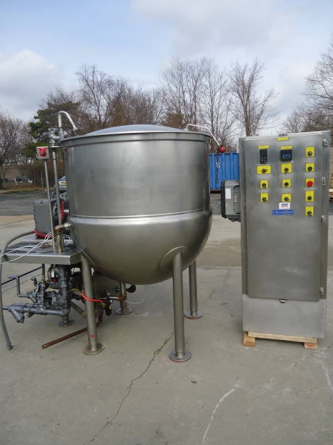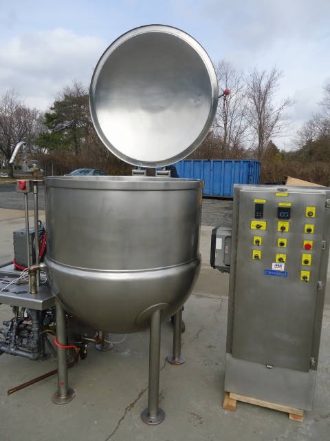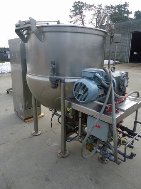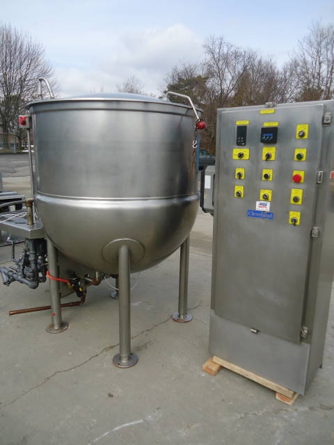 1-Used cleveland/pardo 200 gallon stainless steel jacketed cook/chill horizontally agitated scraper kettle, s/n 7222. Dimensions approx. 44 in. Diameter x 44 in. Deep, kettle is jacketed for 100 psi @ 338 degrees f, national board #2669, code stamped. Equipped with side entering horizontal scraper agitator driven by eurodrive 7.5 hp 3/60/208 volt motor. On stainless steel legs, kettle has approx. 3 in. Diameter center bottom sanitary outlet and stainless steel hinged lid. Equipped with internal temperature probe, kettle equipped with stainless steel control panel with variable frequency drive. (stock # 7664b)