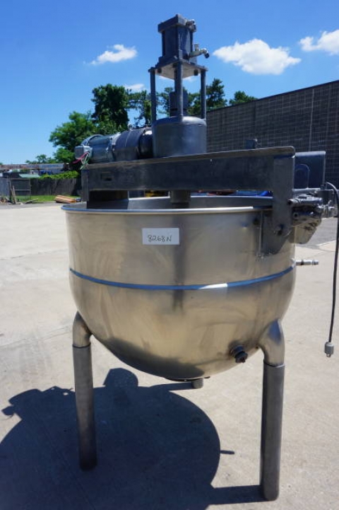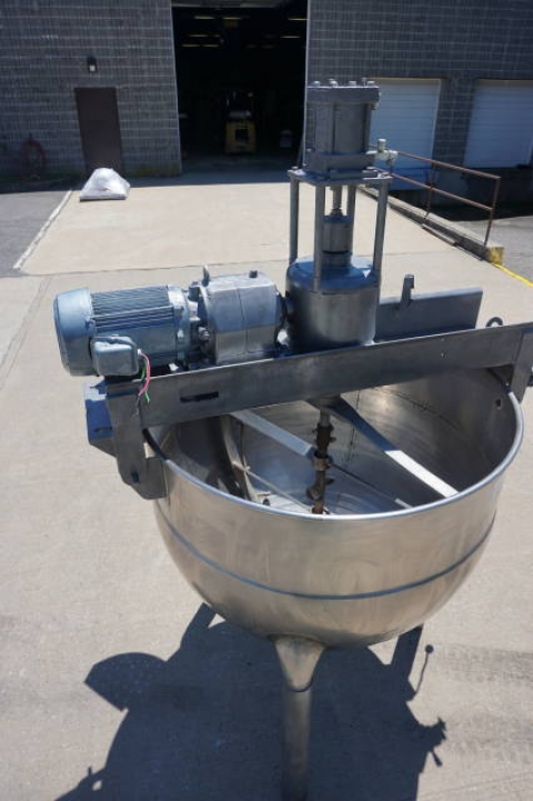 1-Pre-Owned Hamilton 200 Gallon Stainless Steel Jacketed Mixing Kettle, S/N 2338. Dimensions approx 48 in. diameter X 34 in. deep. Jacket rated 125 PSI @ 600 degrees F. Equipped with frame agitation, there is a top mounted electric drive motor. Kettle on approx. 30 in. high legs. Equipped with pneumatic mechanism for opening and closing bottom discharge. (Stock # 8268N)