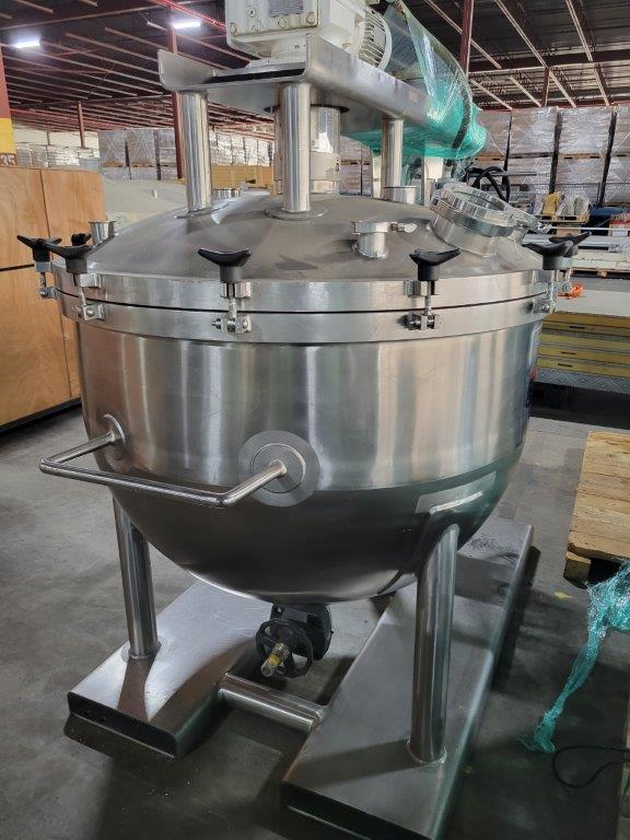 1-Used Lee 200 Gallon Stainless Steel Hemispherical Scraper Agitated Pressure Kettle, Model 200SSAST. Interior dimensions 48 In. diameter X 36 In. deep, kettle has self-contained cylinder for automatic tilt out of scraper agitator. This dome top kettle has approximately 3 In. diameter bottom discharge (Stock # 8751)