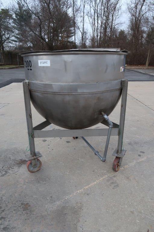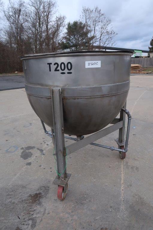 1 – Used Approx. 200 Gallon Stainless Steel Jacketed Hemispherical Kettle. Dimensions approximately 52 In. diameter X 40 In. deep, kettle has approximately 2 In. diameter center bottom outlet with Tri-Clamp fitting. On legs with casters for portability. (Stock # 8720C)