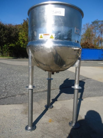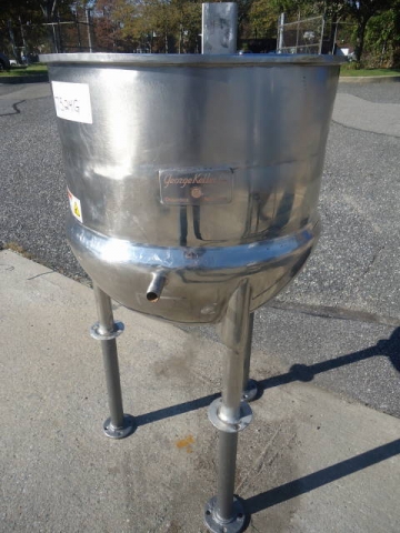 1-Used lee 25 gallon stainless steel jacketed kettle, s/n 959-s. Dimensions approx. 24 in. Diameter x 25 in. Deep. Jacket rated 40 psi @ 288 degrees f. On legs, kettle has stainless steel agitator mount and bottom center outlet. (stock # 7524g)