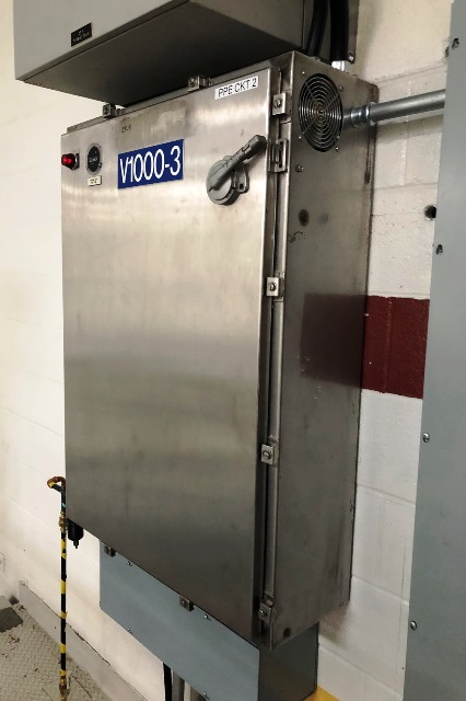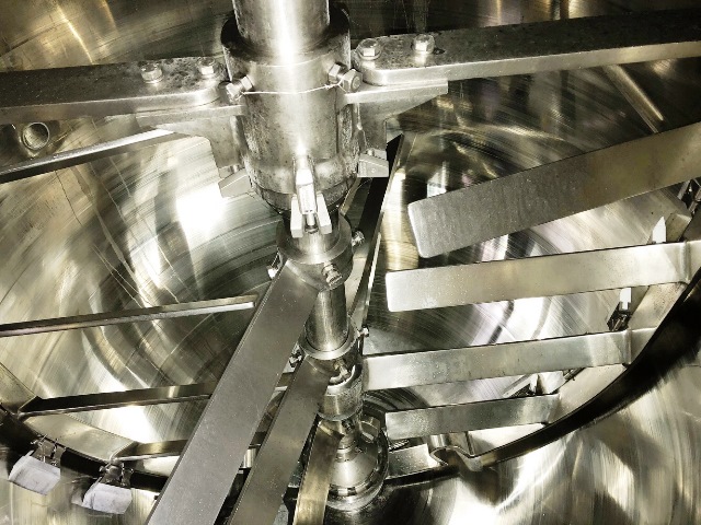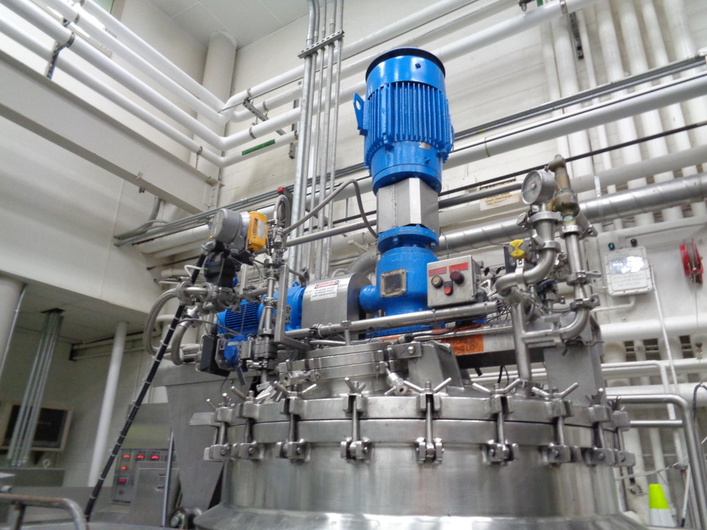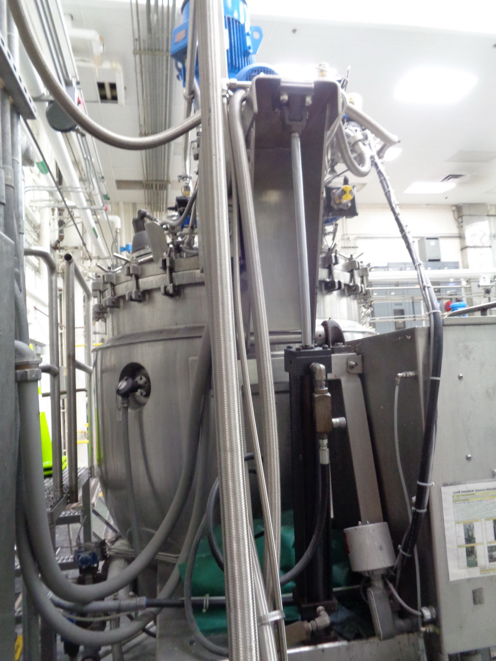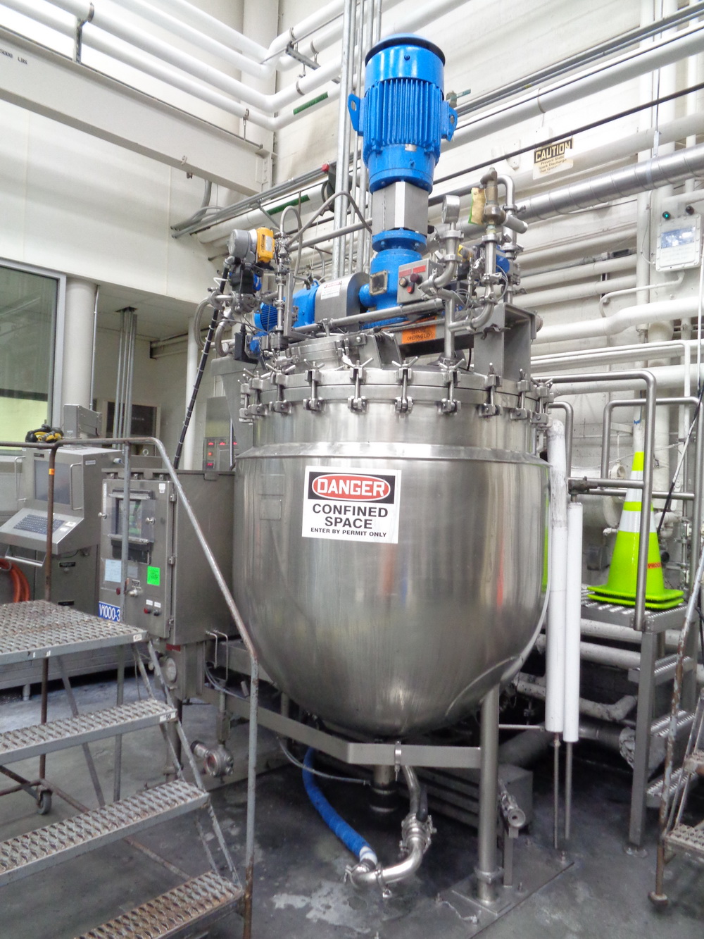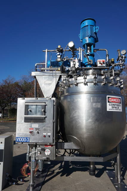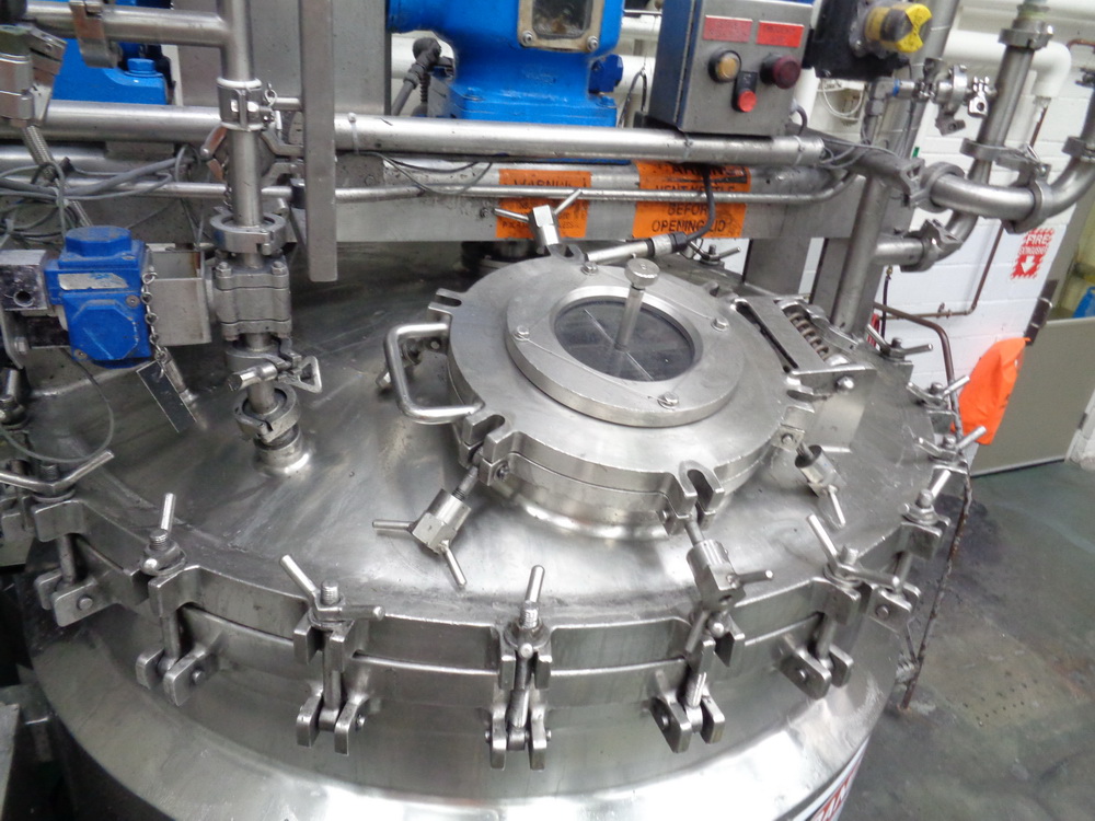 1-Used Greerco Approx. 250 Gallon Capacity Stainless Steel Jacketed Triple Motion “Agi-Mix” Vacuum Kettle/Reactor. Equipped with J.C. Pardo and Sons Vessel (S/N 4329). Vessel dimensions approx. 48 In. inside diameter X 54 In. Deep, Vessel is jacketed for 100 PSI at 338 Deg. F., National Board Number 2127, Code stamped. Internally rated 20 PSI at 250 Deg. F., and is suitable for vacuum as well. Unit has high speed homogenizing head top driven by 25HP 3/60/460 Volt motor. Double motion scrape surface agitation separately driven by 5HP 3/60/220-440 Volt motor. Equipped with “tilt-out” agitation through self-contained hydraulic motor and cylinder. On stainless legs, Vessel has center-bottom outlet with valve as well as Allen Bradley panel and stainless steel starter panel. Dished top head has quick opening bolts and 12 In. diameter manway with hinged lid and sight glass. (Stock #8324)