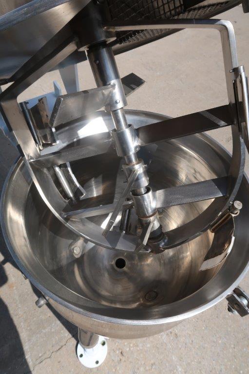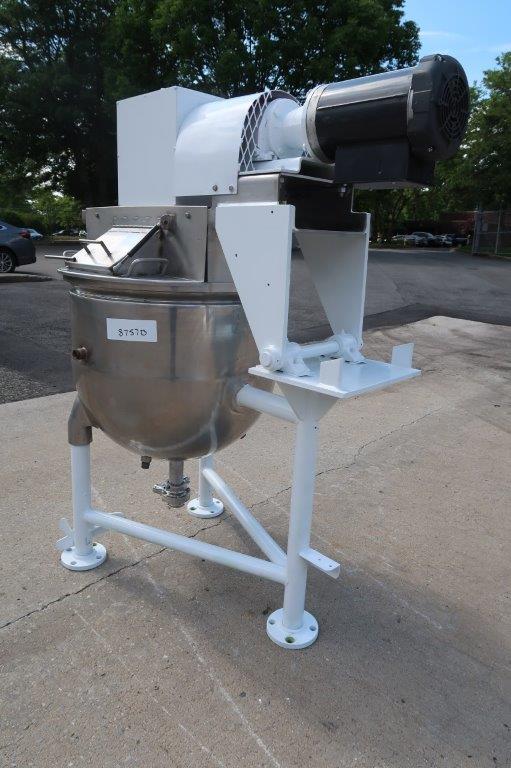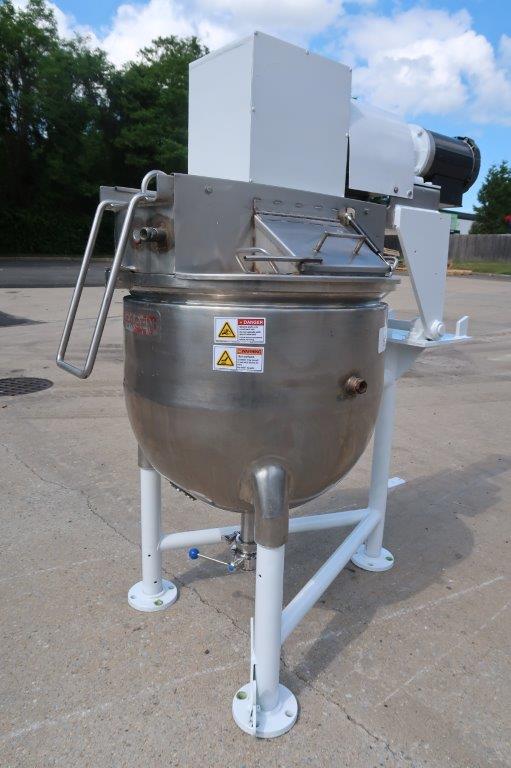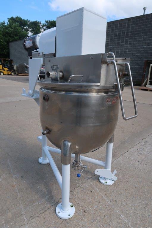 1-Used Groen 30 Gallon Type 316 Stainless Steel Jacketed Double Motion Kettle, Model DA-30-SP. Interior dimensions approximately 24 In. diameter X 20 In. deep, kettle is jacketed for 45 PSI @ 300 Deg. F., National Board number 23302, Code Stamped. Equipped with “tilt-out” double motion scraper type agitation driven by 1.5HP, single phase, 60 cycle, 115-208/230 Volt motor. On casters for portability, kettle has stainless steel 2-piece lid, is on legs, and has approximately 2 In. diameter Tri-Clamp discharge. (Stock #8757B)