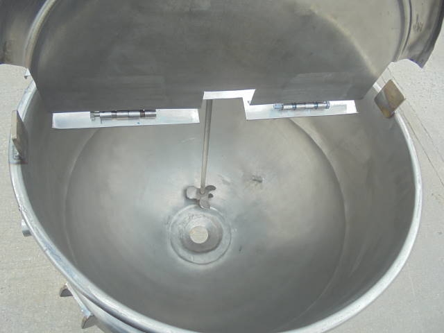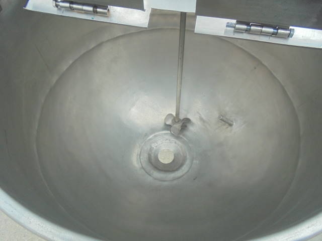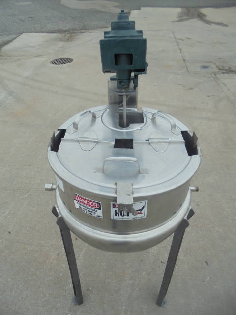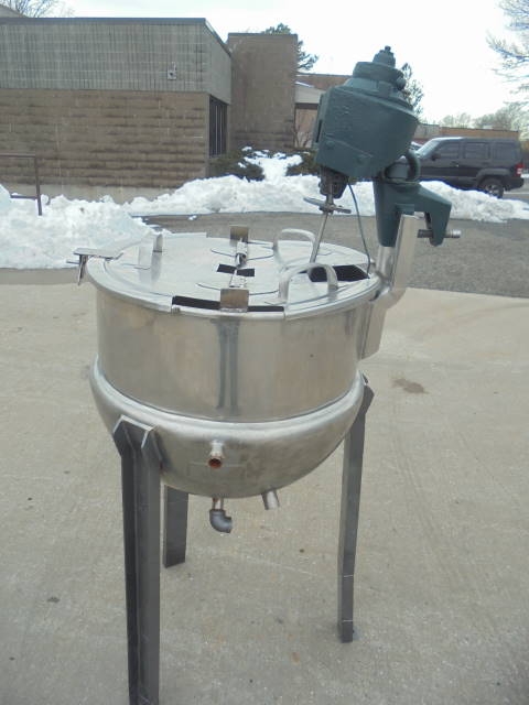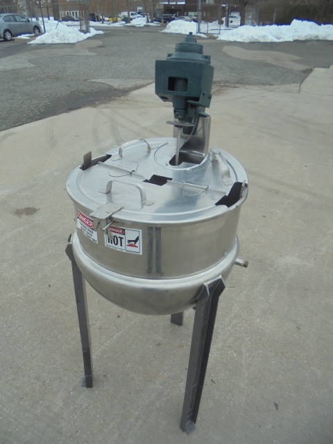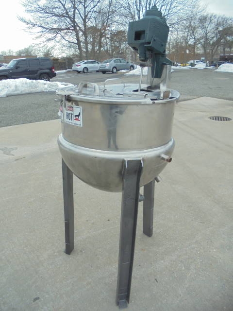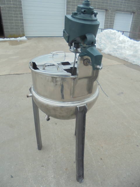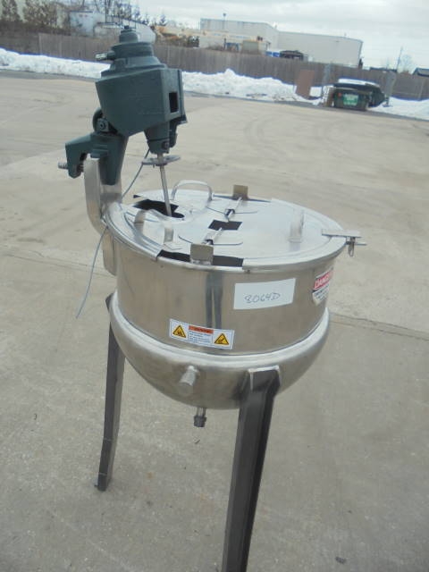 1-Used Lee 30 Gallon Stainless Steel Jacketed Hemispherical Kettle, S/N 798-S. Dimensions approx. 24 in. diameter X 21 in. deep, Kettle jacketed for 40 PSI @ 280 degrees F, Code Stamped. On approx. 36 in. high legs, Kettle has two-piece cover and stainless steel agitator mount. With bottom outlet measuring approx. 2 in. Kettle can be supplied with Lighnin air operated mixer with prop agitator at additional cost (Stock #8064D)